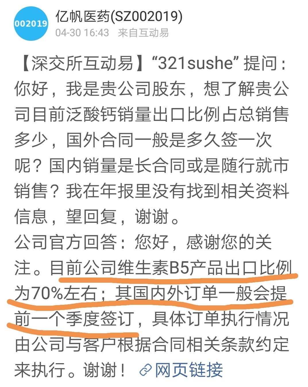 今年其实我一直有他的仓位,只是多与少的问题,我关注他是从80元的泛酸钙开始起涨,那波最终上到290,后回到200,目前在340,。泛酸钙亿帆的成本估计在53元左右,我知道他的一季度不如预期,所以亿帆那个一季度出来的利空,我加仓稍多。