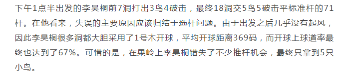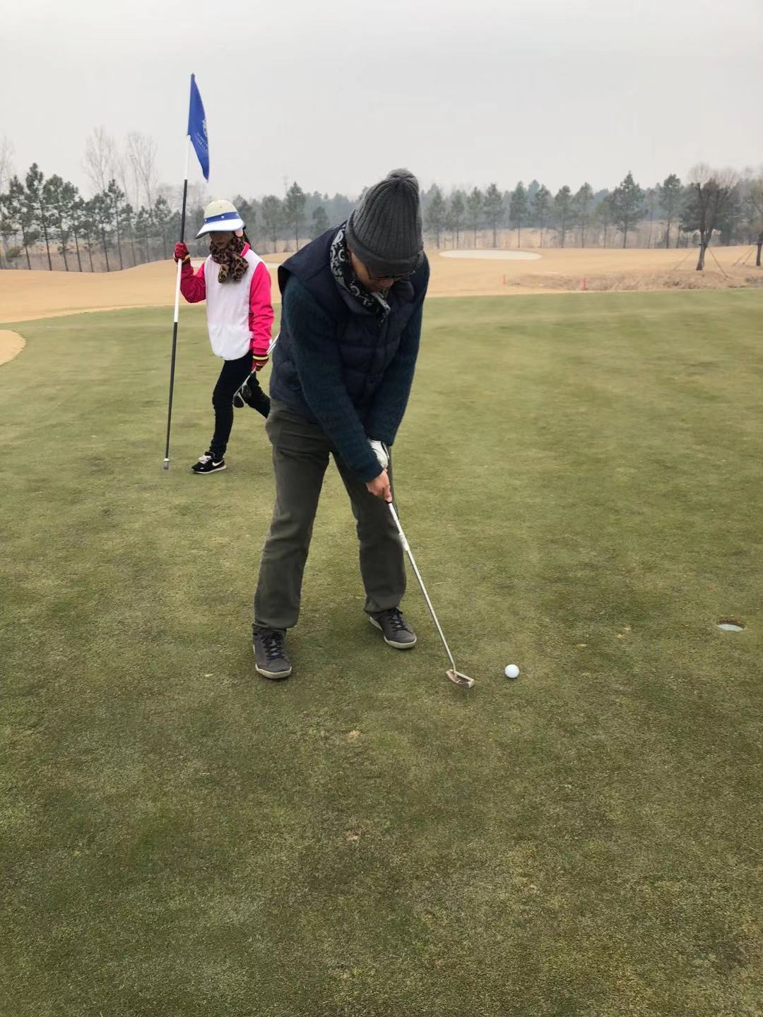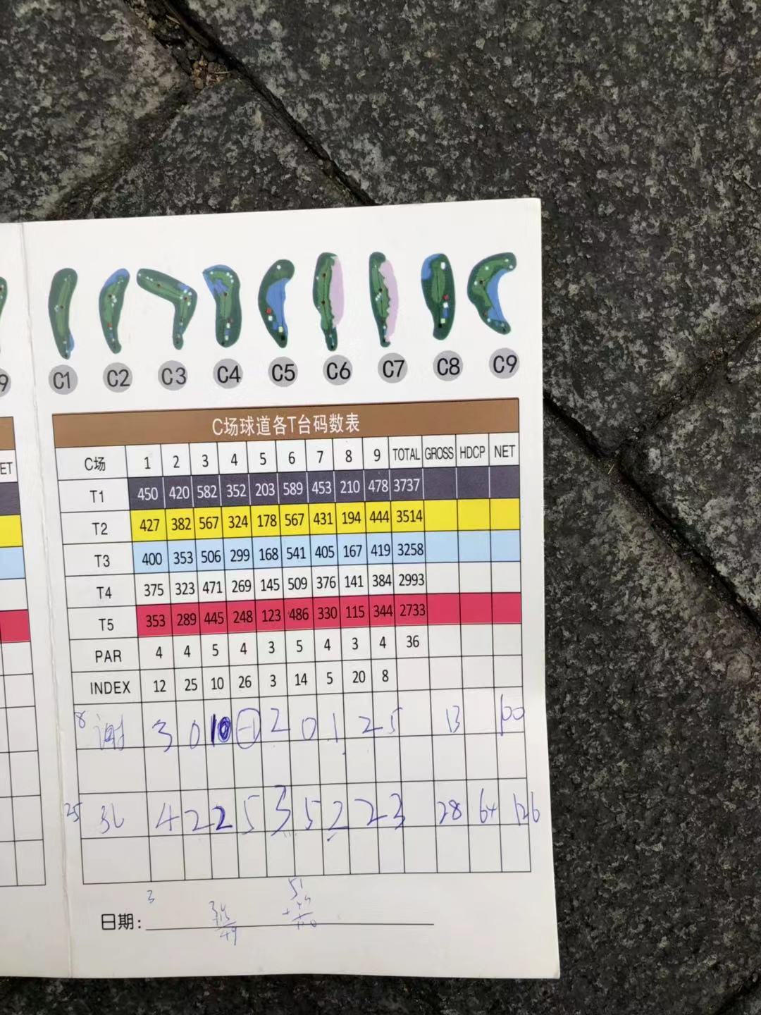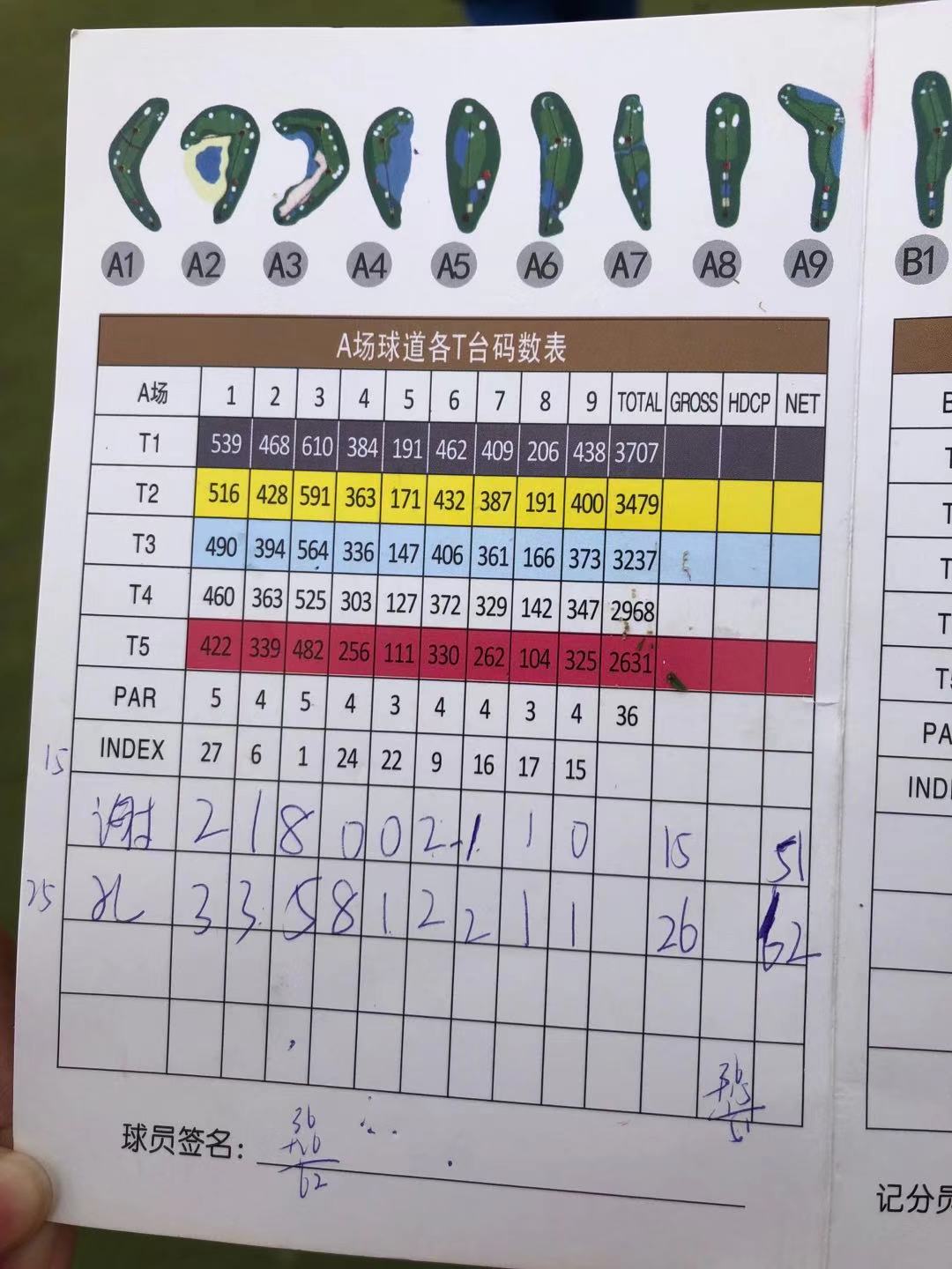 今天打的这场已经是近来打得最好的一场球了,但还是打了100杆,最后面那个+5成绩的洞有点玩的心态,所以导致了二个ob球。总结的是,推杆太臭了,这100杆,有49杆推杆,五个四推,五个三推,好几个小鸟推只抓了一个。不过一号木今天依然有打超过300码距离的,120码内的距离都是一杆上果岭,只用一号木,剩下最大的杆就是七号铁了,没用铁木杆跟球道木,自己阅读果岭,不要球童摆线,小流氓模式,打不过原地打。越打下去,越觉得高尔夫并不容易,毕竟要精确的击球落点。球童的话说,一号木与铁杆是70几杆的水平,推杆是120杆的水平。希望明年这个时候,能达到80多杆的水平吧。加油,努力吧!体重由最重时候的164斤到现在144斤了。