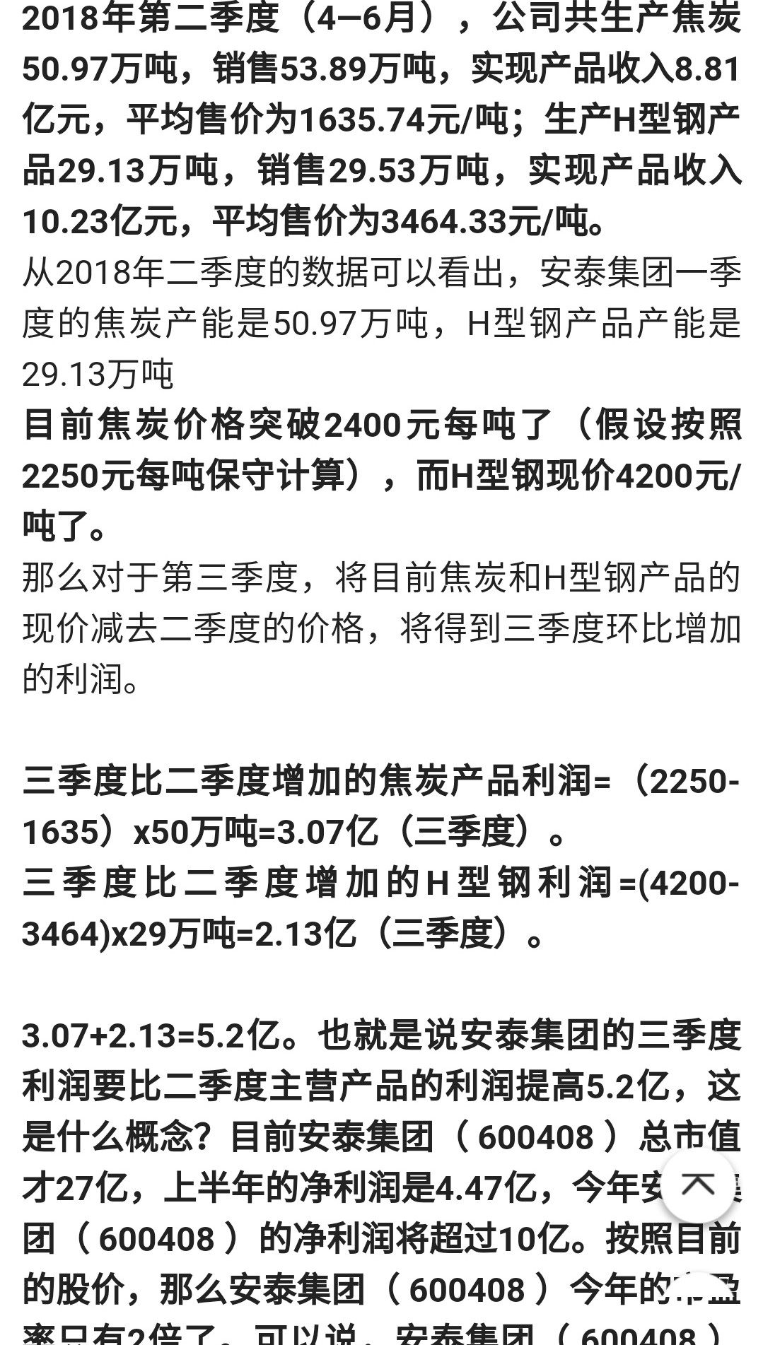 安泰的一二季度的焦炭均价基本上是一样的,可能二季度还稍低点,所以有这个营业收入挺可以了。我当初预期比这个还低的,所以在8月9号时才会选择出掉部份的,这个问题不大了,真正要甄别这几个焦炭股哪个好,要到三季报看了才知道。大的问题是我担心这个公司会不会假帐这个方面了,因为有前科,不太信得过。所以我最多持仓不超过8位数。总体上这波大宗商品最强的就是焦炭以及pta,所以我就持有这二个商品的股票,只是因为安泰的信誉差点所以仓位很低而已。这是信用问题,我不会重仓赌信用!