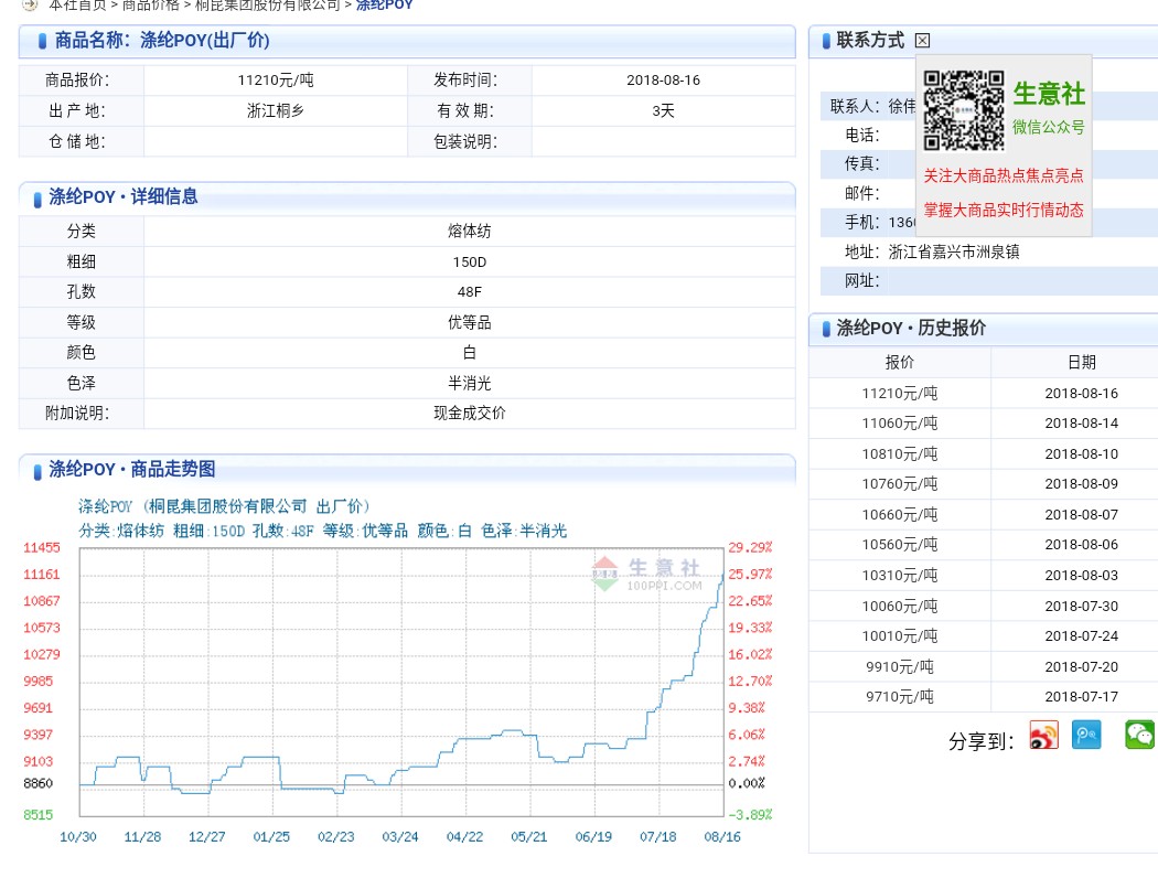 A: 当年油价100多美金的时候,涤纶长丝买到17000-18000/吨,销路也很好。涤纶长丝作为物质原料,在下游织物行业占比不高(一件衣服可能就会用到0.5kg长丝),目前下游的服装家纺的大部分成本是在流通和销售环节,所以下游对长丝价格并不敏感。目前产品的库存是历史底点,说明只要生产出来就不愁卖。