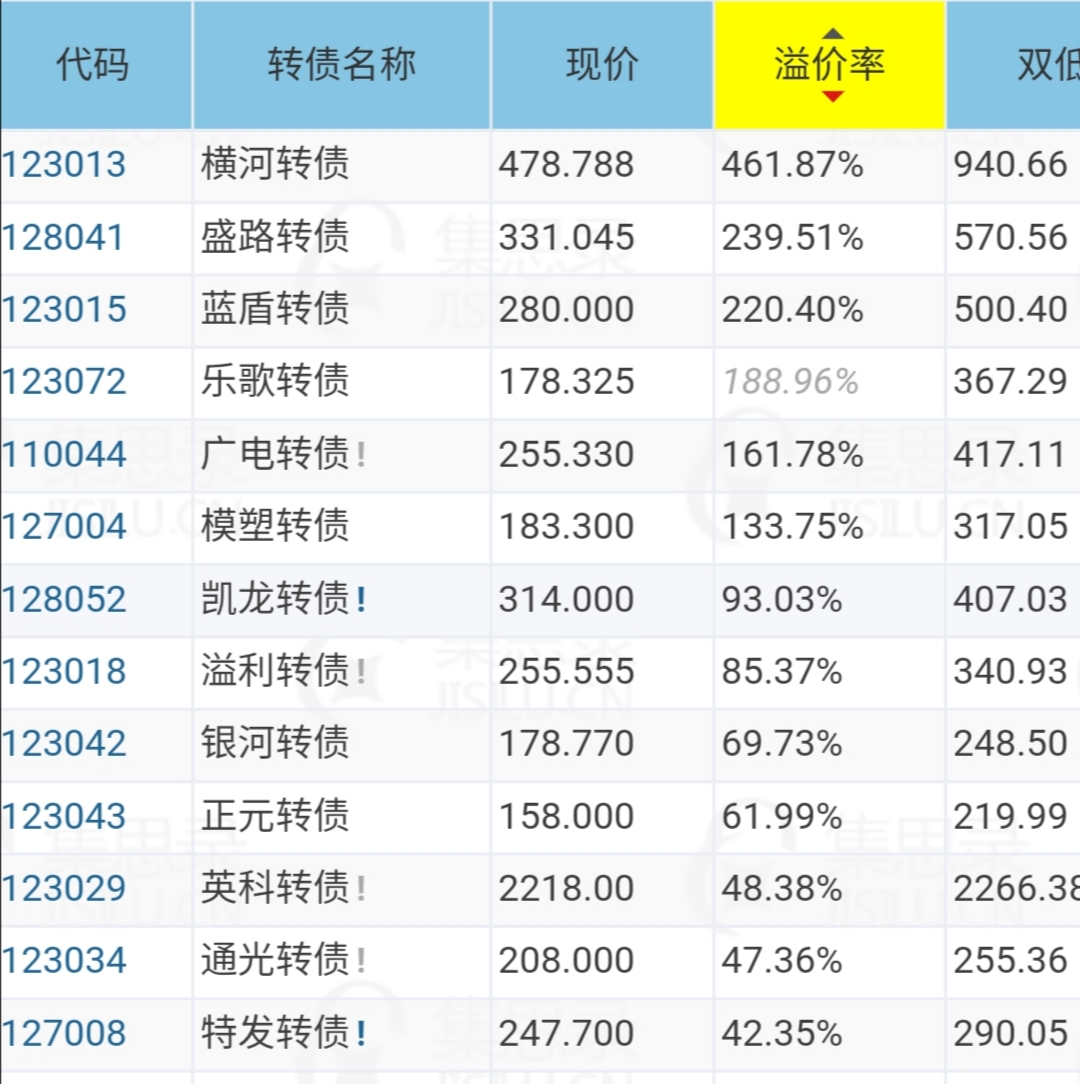 现 价 溢价率 双低值