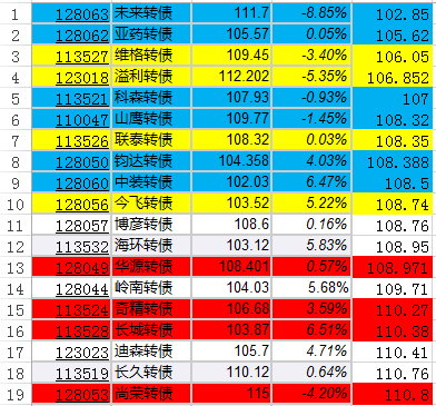 13 113514 威帝转债 101.3 7.28% 108.58 A+ 4.071