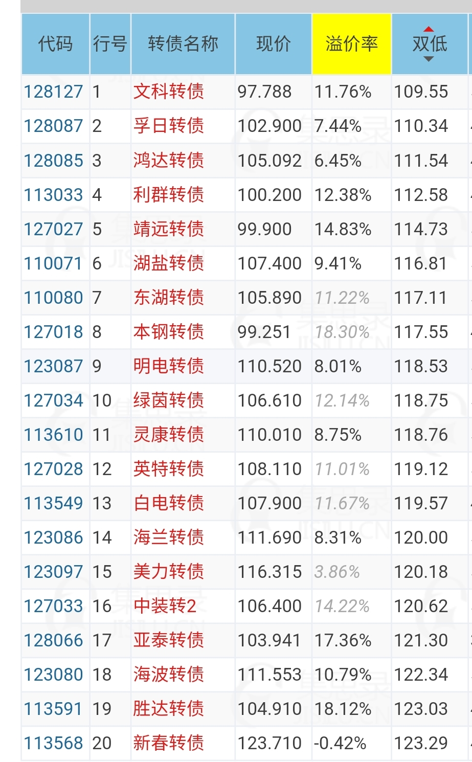 对可转债价格和溢价率*100进行相加,值越小排名越排前。统计结果如下