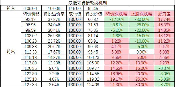 单一脉冲调仓:中位价格小于110元,则要求价格120元以上,且双低值125以上。中位价格大于110元,则要求价格125元以上,且双低值130以上。同时需比新标的双低值大10以上,要有一定的阈值,比如双低值130.5轮到119。