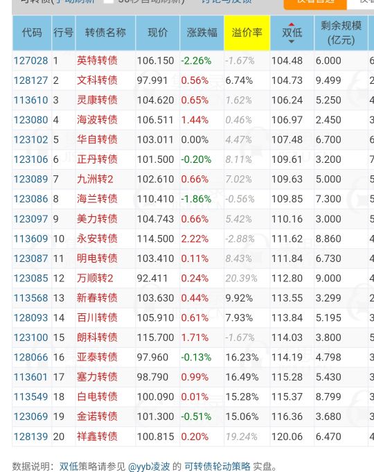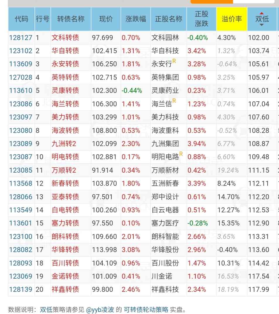 大家都知道,19年20年的双低转债115元以下的转股溢价率很少有溢价率小于15%的。现在溢价率15%以内有大面积115元以下的转债。