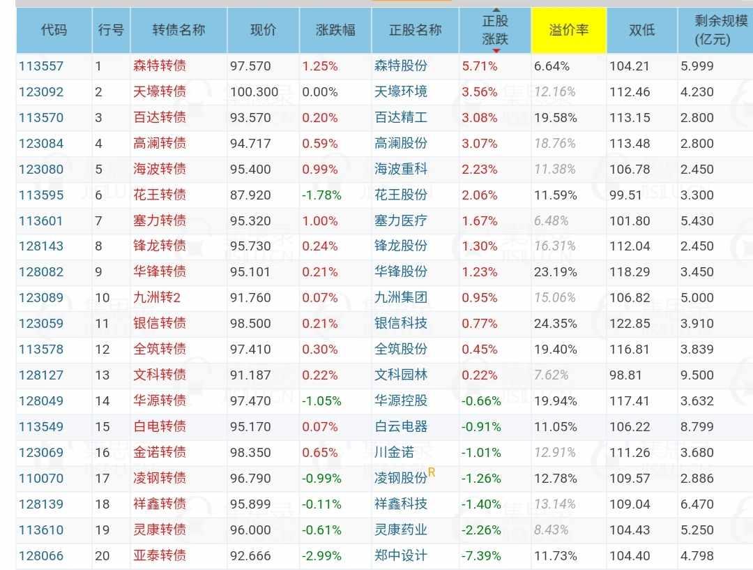 现 价 溢价率 双低值