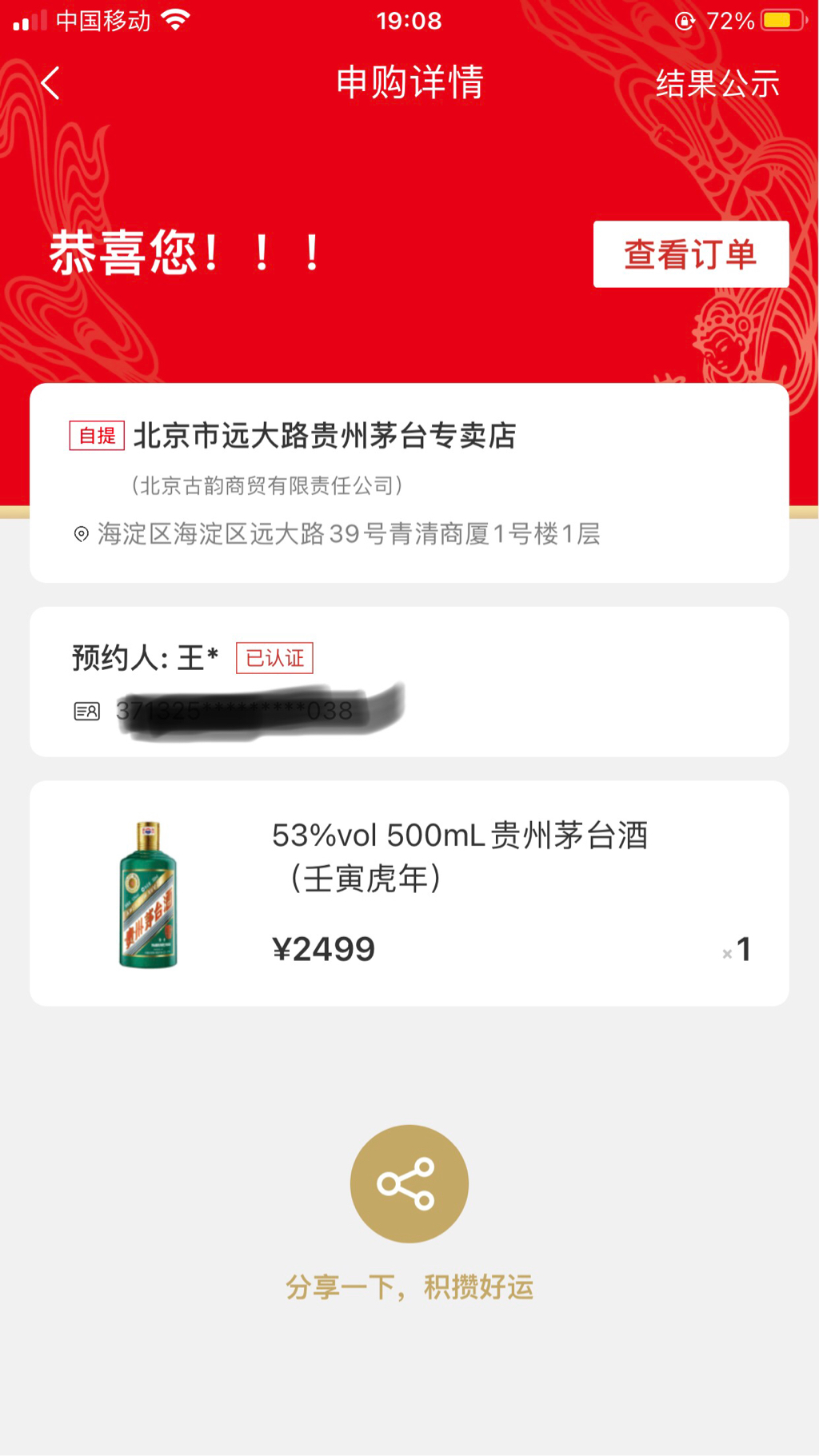 给大家鼓鼓劲,家里4个账号,从7月开始申购,到今天中了3瓶虎茅了。