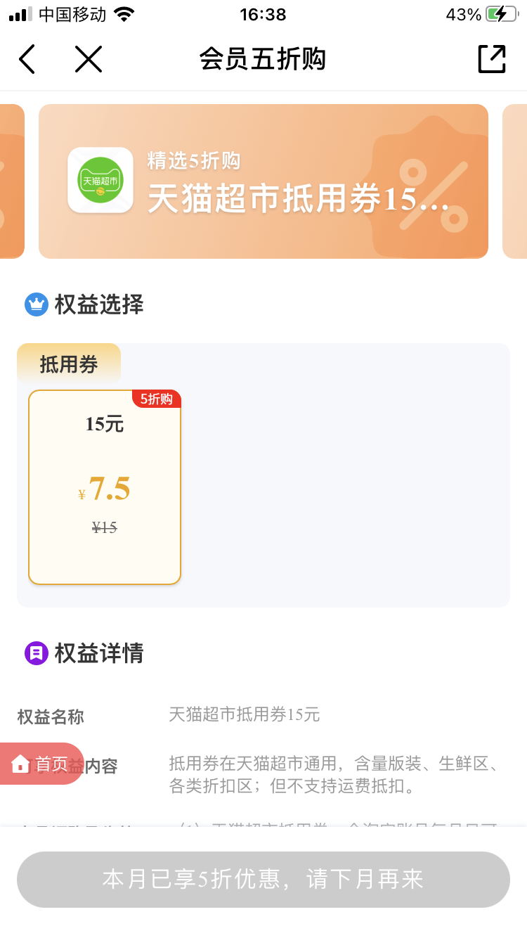 注意是会员五折购,而非其他,我刚才也看到了你私信说的那个23元权益礼包了。和我说的并非一回事,那个看上去很像一个坑,因为实质只有3元猫超卡。