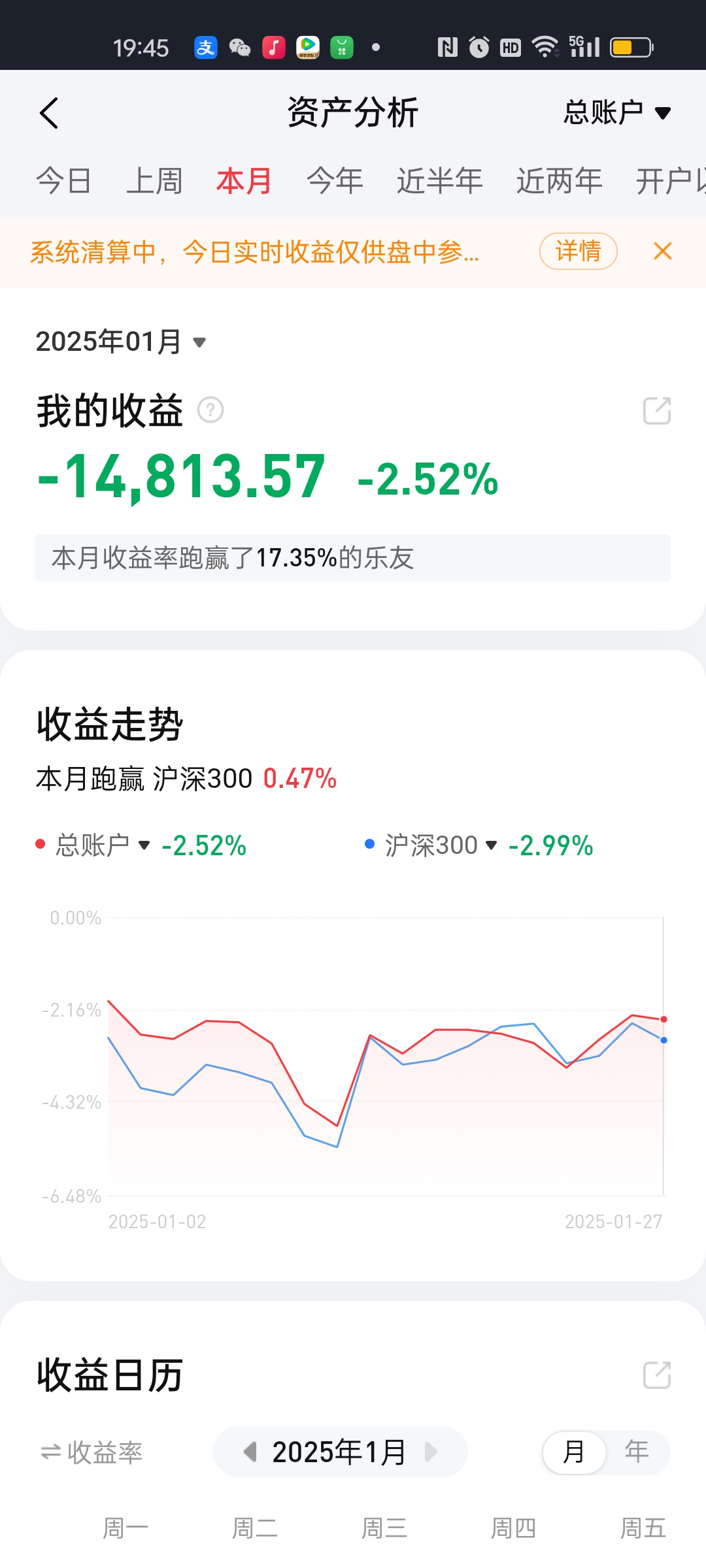 2025年1月收官。本月账户收益-2.52%。大盘收益-3.02%。