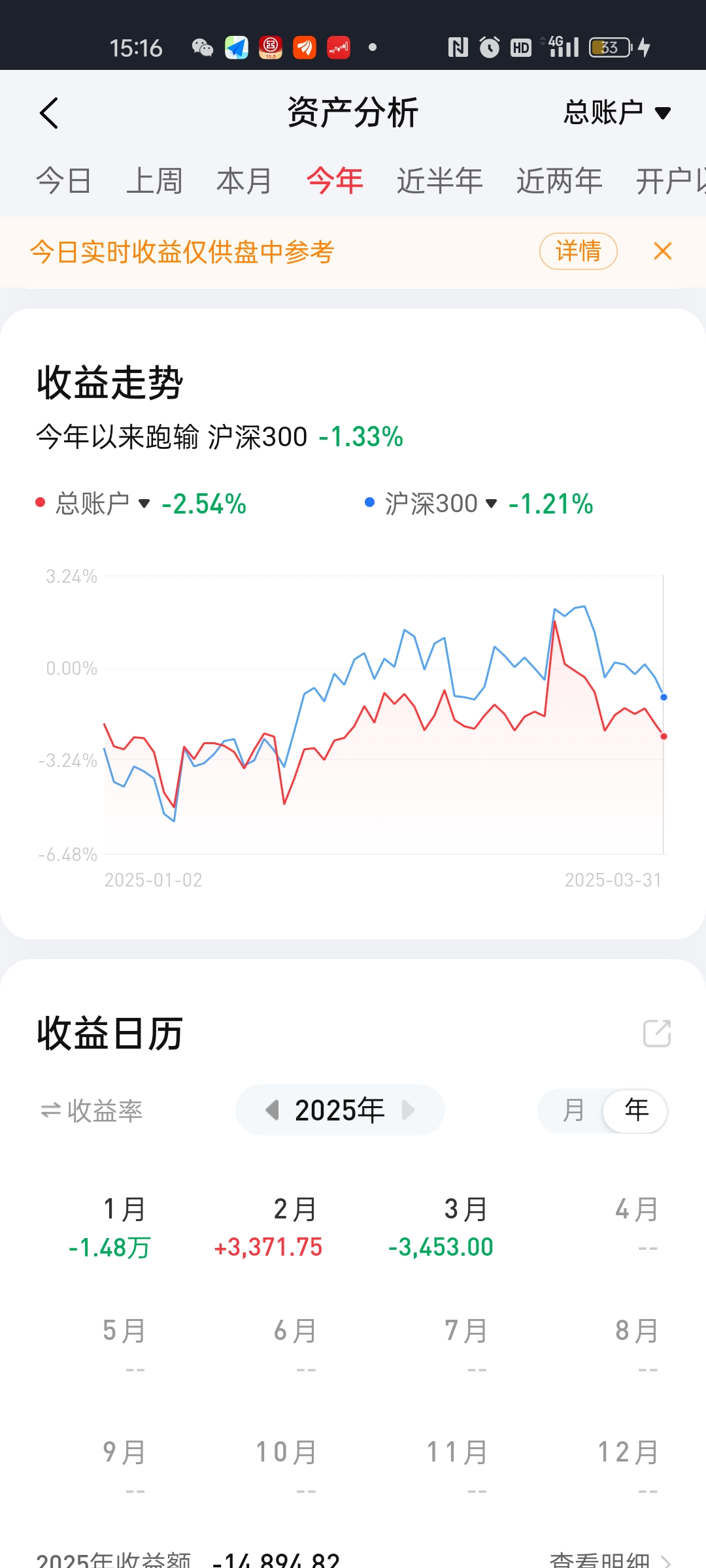 2025年3月收官。本月账户收益率-0.6%,年收益率-2.54%。大盘月收益率0.45%,年收益率-0.48%。