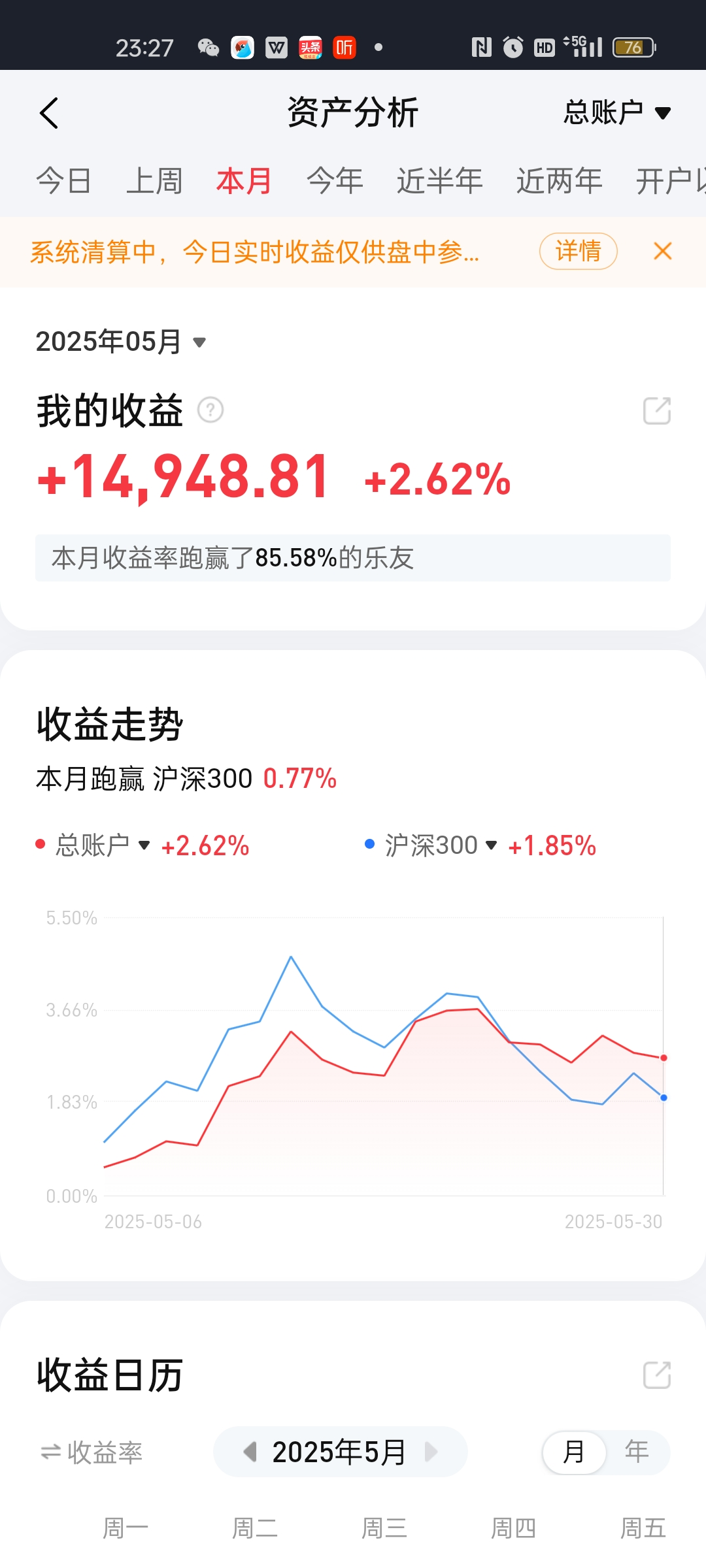 2025年5月收官。本月账户收益2.62%。大盘收益2.09%.