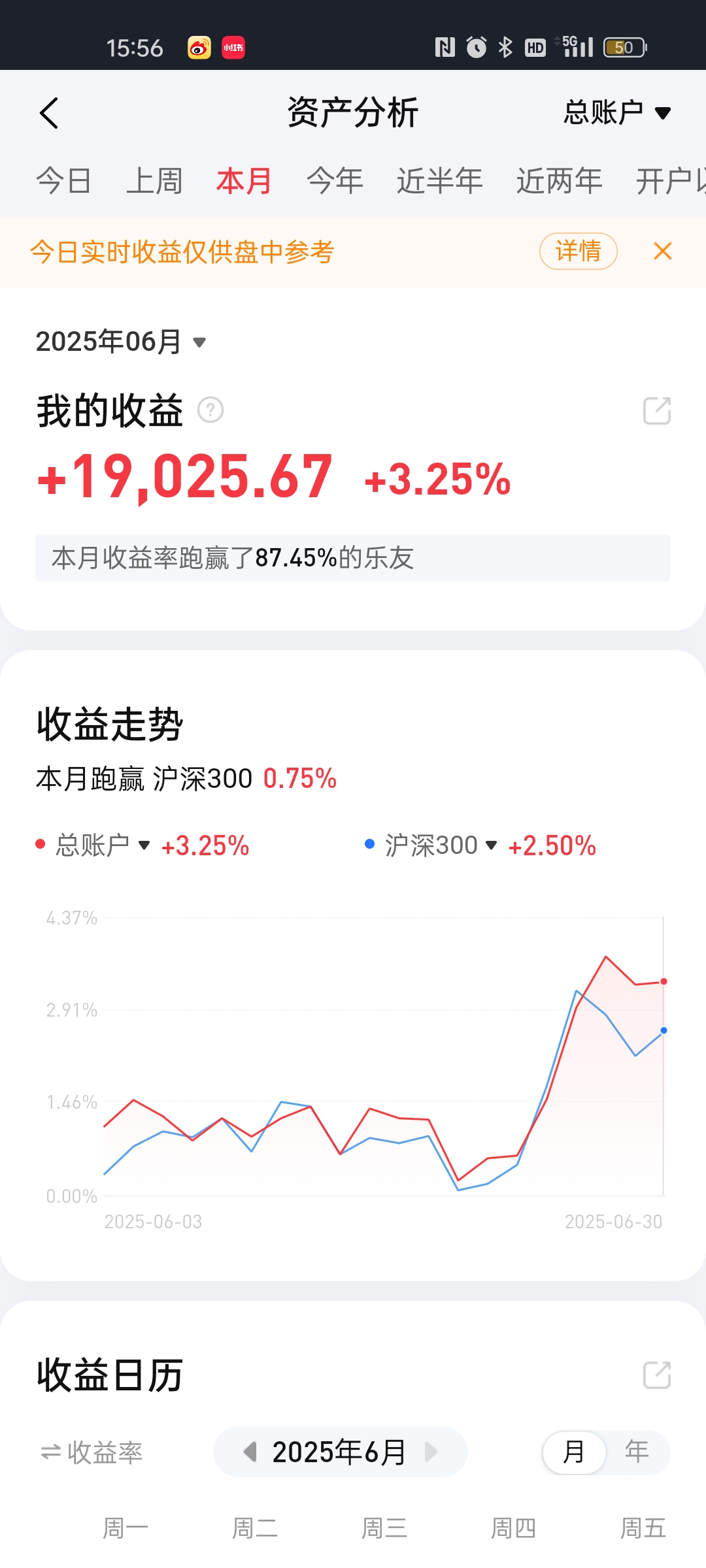 2025年6月收官。本月账户收益3.25%。大盘涨幅2.9%。年度收益本账户2.97%。大盘2.76%。