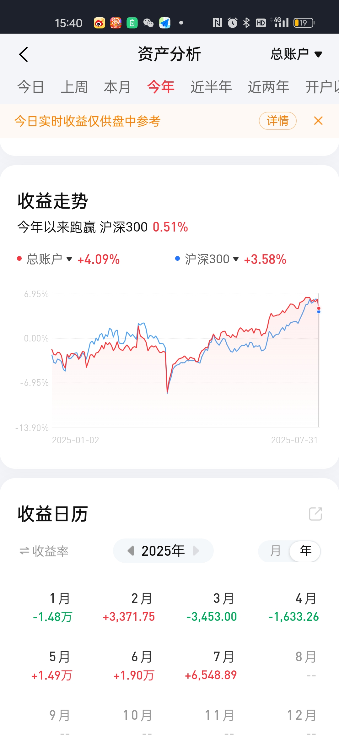 2025年7月收官。孩子今年高考,考上理想大学本硕博连读。7月初将账户交给她自己管理,但还是按照以前的量化方式操盘。也算训练一下孩子的自我管理约束能力。本月大盘涨幅3.78%,账户涨幅1.08%。年收益率本账户4.09%,大盘6.61%。两只股票基本在底部磨来蹭去。慢慢等量化操作不着急。