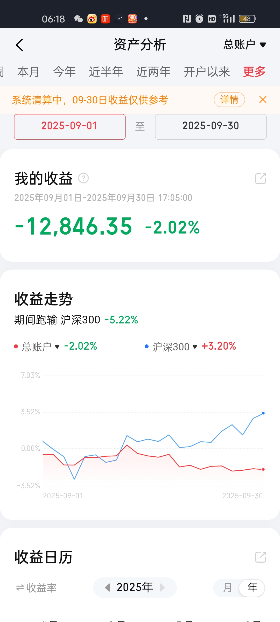 2025年9月收官。本月账户收益-2.02%,年度收益5.95%。大盘月收益0.64%,年收益15.84%。今年是个科技牛年,