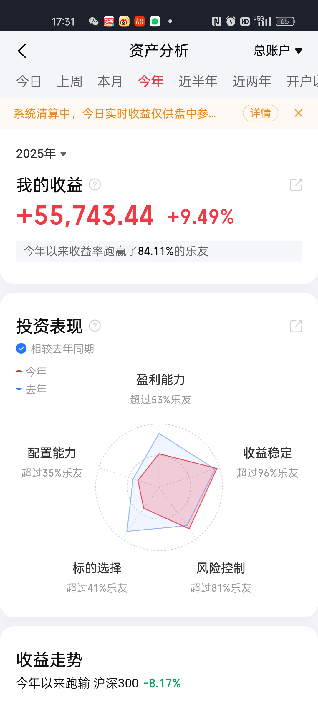 2025年10月收官。本月大盘涨幅1.85%,账户涨幅1.02%。年度收益大盘17.99%,账户7.04%。乐友幸会,为啥我的年收益10.59%只跑赢了77.46%的乐友呢?华泰这算法摸不着头脑的感觉。