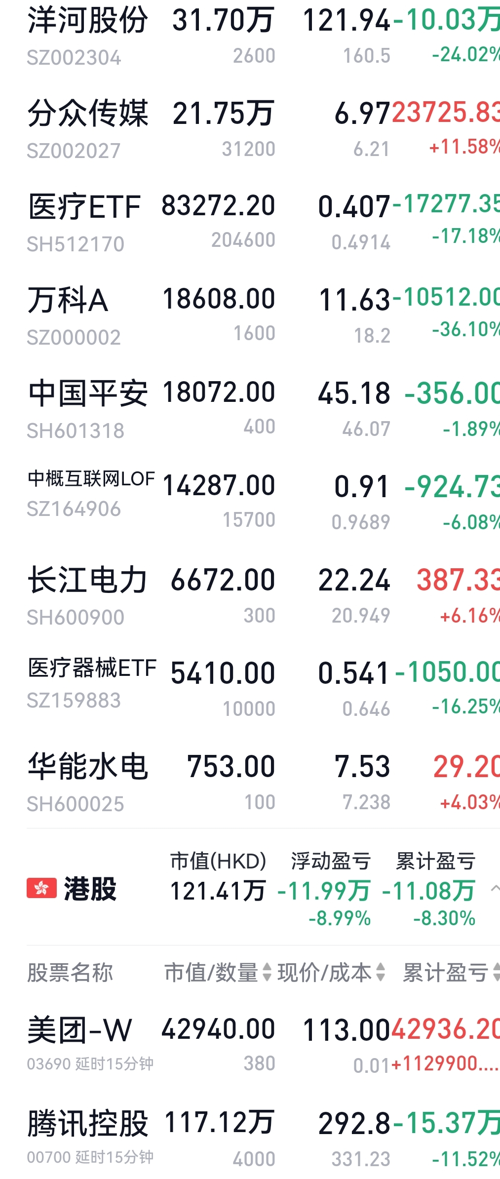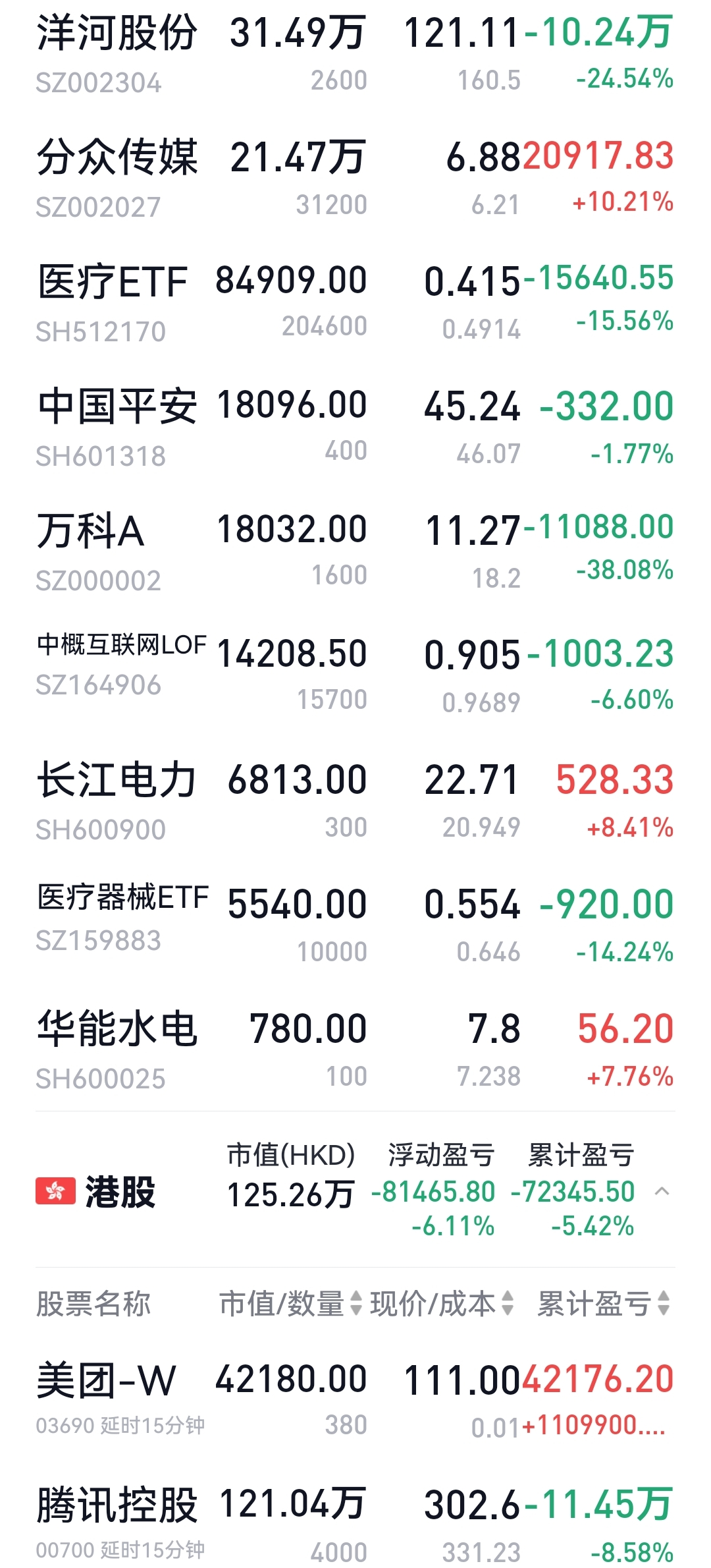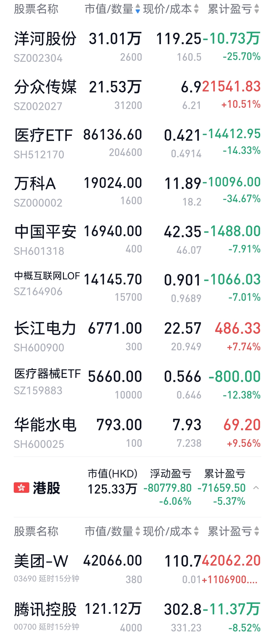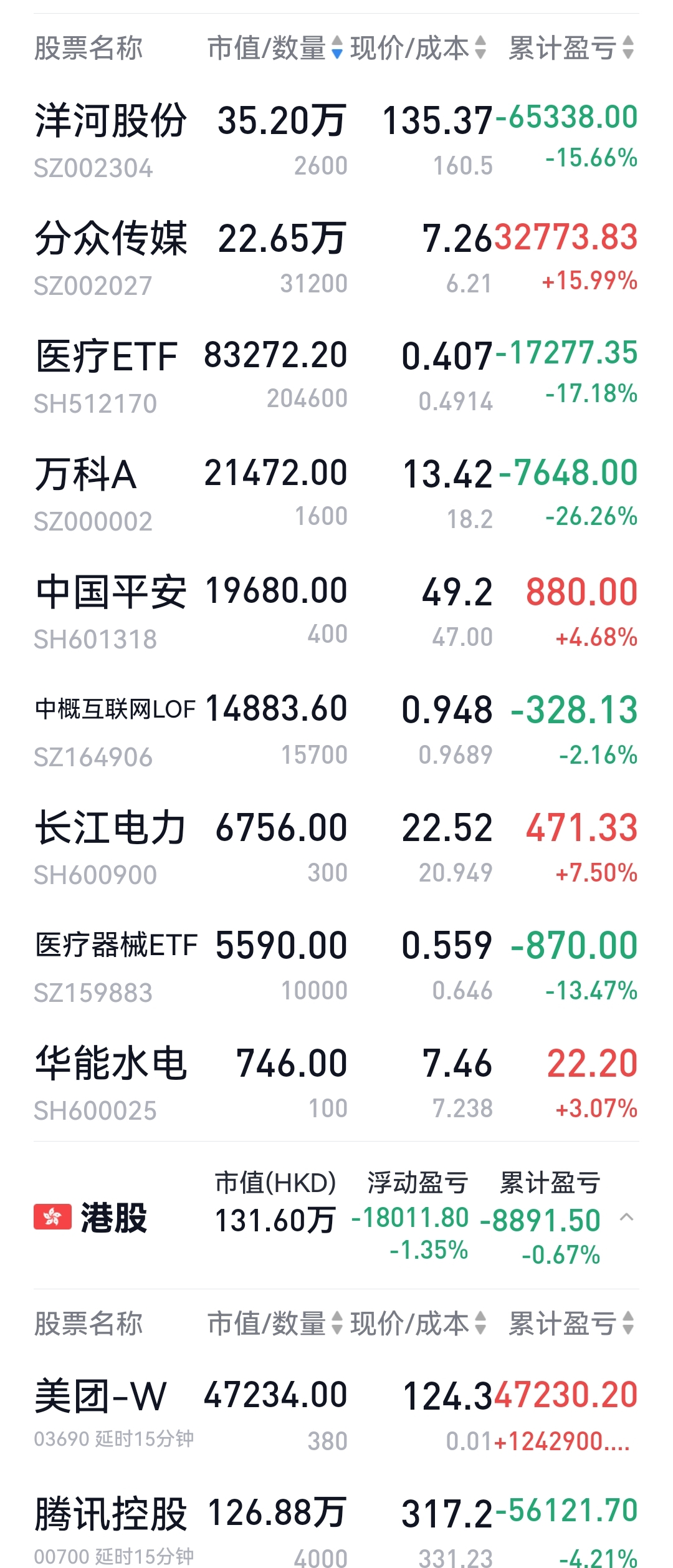 我的持仓没有港股没有企鹅就索然无味了。洋河下跌0.65%。分钟下跌1.73%。医疗上涨0.25%。