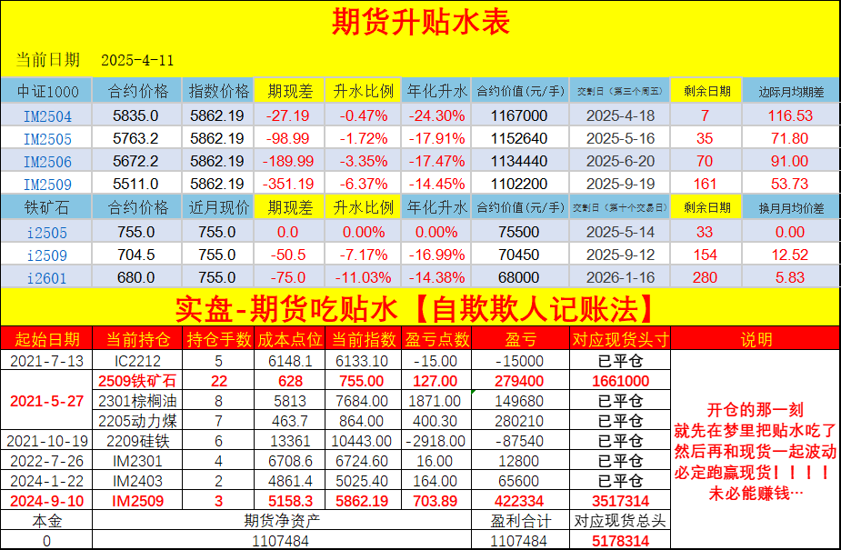 我是按期货的合约价格建仓记录持仓成本,按现货价格计算利润,纯粹为了让自己看得开心,所以自嘲为自欺欺人记账法,能持有到期的话,结果会和按期货合约价格记账的效果一样。一方面让自己看着舒服,一方面让自己能够以更长远的眼光看待价格的短期波动。
