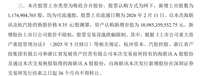 300277 2026/2/9 海联讯:换股吸收合并杭州汽轮动力集团股份有限公司暨关联交易之实施情况暨新增股份上市公告书http://disc.static.szse.cn/disc/disk03/finalpage/2026-02-09/f9ed1c99-52d9-4ba7-bba8-df1c54ed4515.PDF来了,2/11上市。我账号里怎么还没有,你们的到账了吗