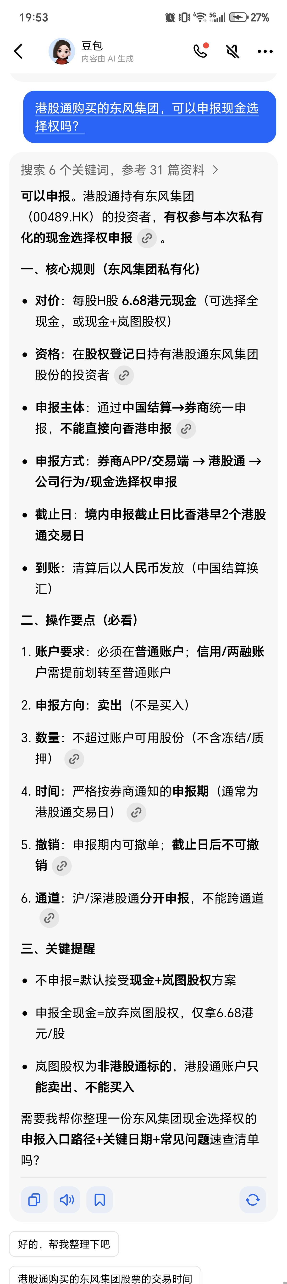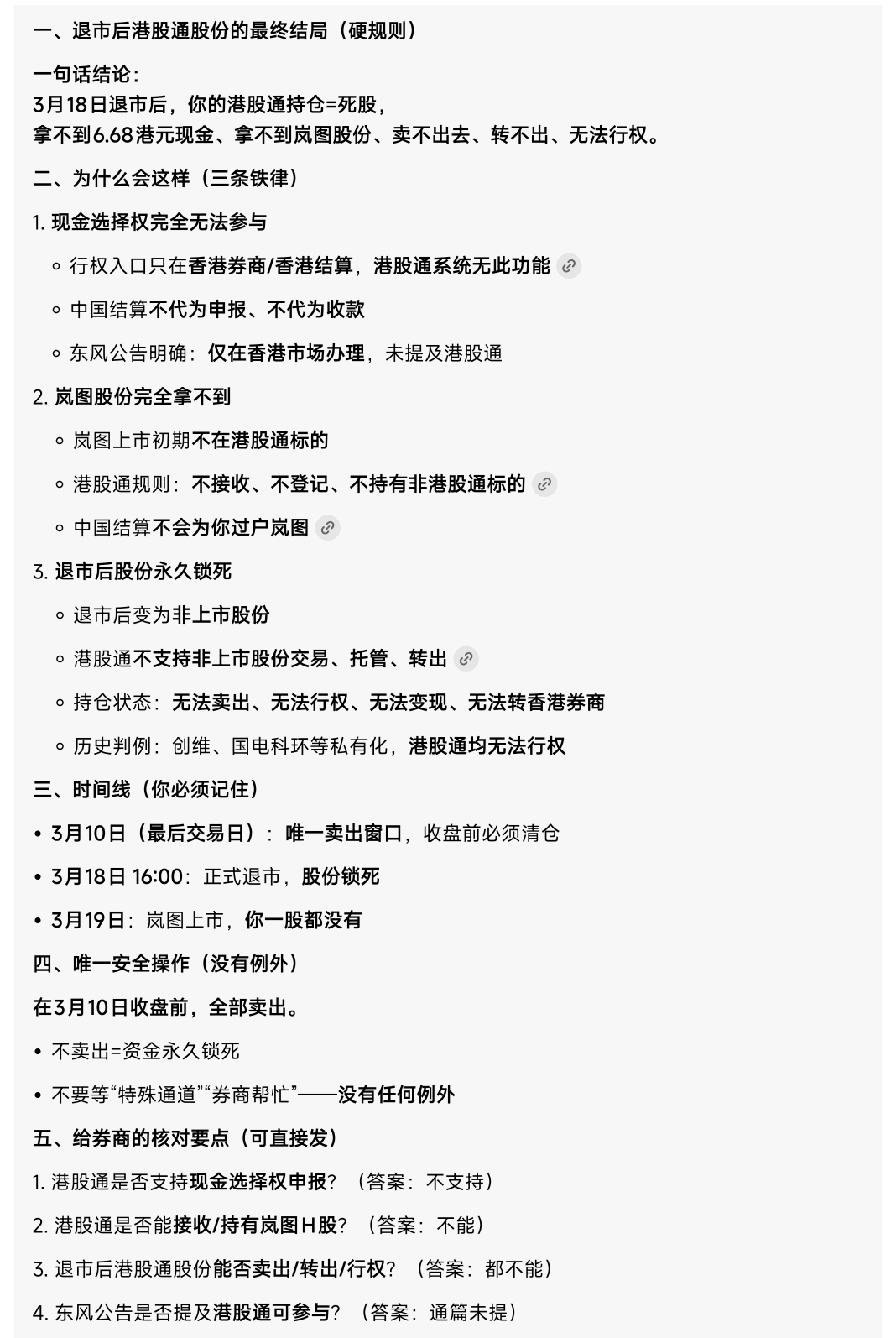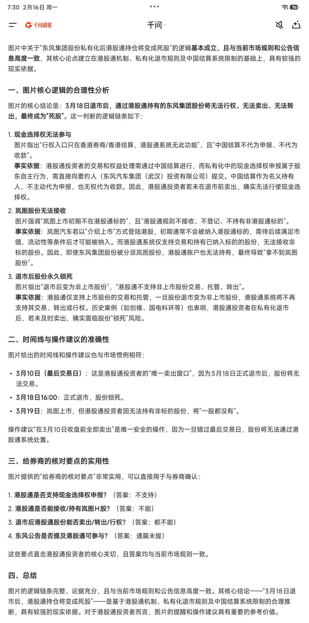 为此,特咨询了券商,华泰的答复:现金部分,不需要交税,但需要收取q1的印花税,股票部分,因为港股通目前对境内A股账户执行的是资本利得免税,在2027年1月1日前,不收取因买卖股票获得的股价差值部分的税收,在之后,需等待相关政策。岚图股票上市定价,以24年末公司财务状况估值已不再符合目前的公司的发展情况,但公司股票是介绍上市,新股票上市都是原有东风的老股东,流动性不足,会影响到上市价格,但25年公司...刚才看了一下综合文件。 “香港印花稅