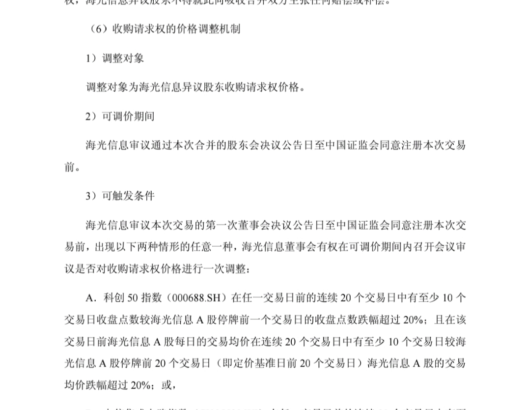 合并换股的模板都是这样的,都会有这个条款;大体走流程就是半年,科创50或者中信集成电路指数跌20%相对比较难,当然也是会增加风险的,并不是100%确定性的;最大的主要风险还是在于判断能否合并成功,各方合并的动力和目标是什么,如果能够找到他们动力很强的证据,就可以拿到很高的确定性。