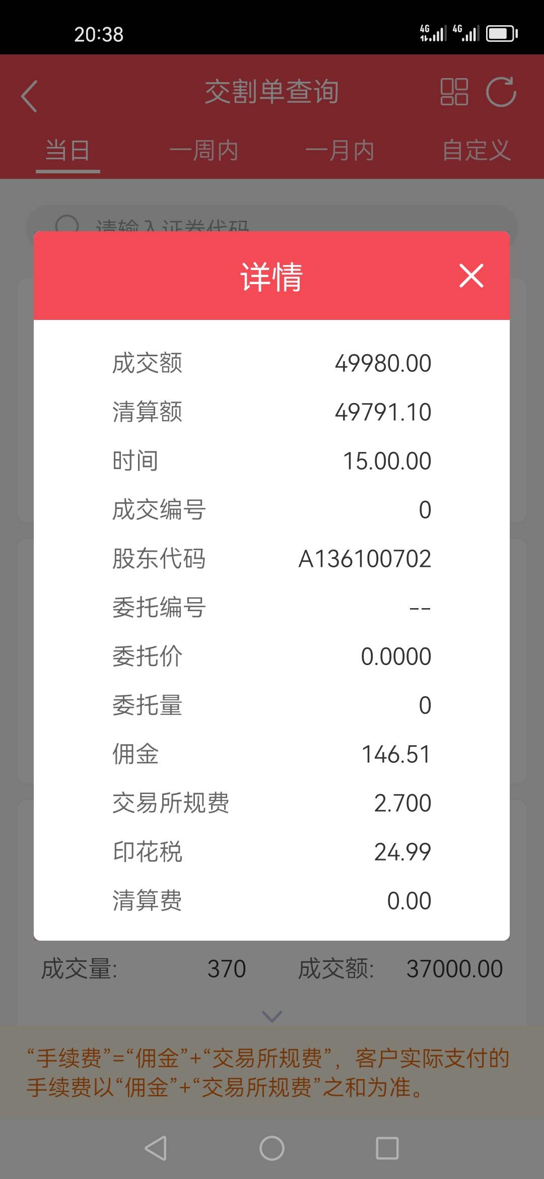 上面的还是写错了,改正如下,我的三个券商印花税0.5‰,手续费1/万是一样的。主要在经手费差异很大,银河按照数量的1‰收取。国金按照数量的5/万收取。浙商证券按照金额的1/10万收取,经手费银河证券跟浙商证券差了30倍。国金证券哪有你说的经手费?这是我国金证券的截图