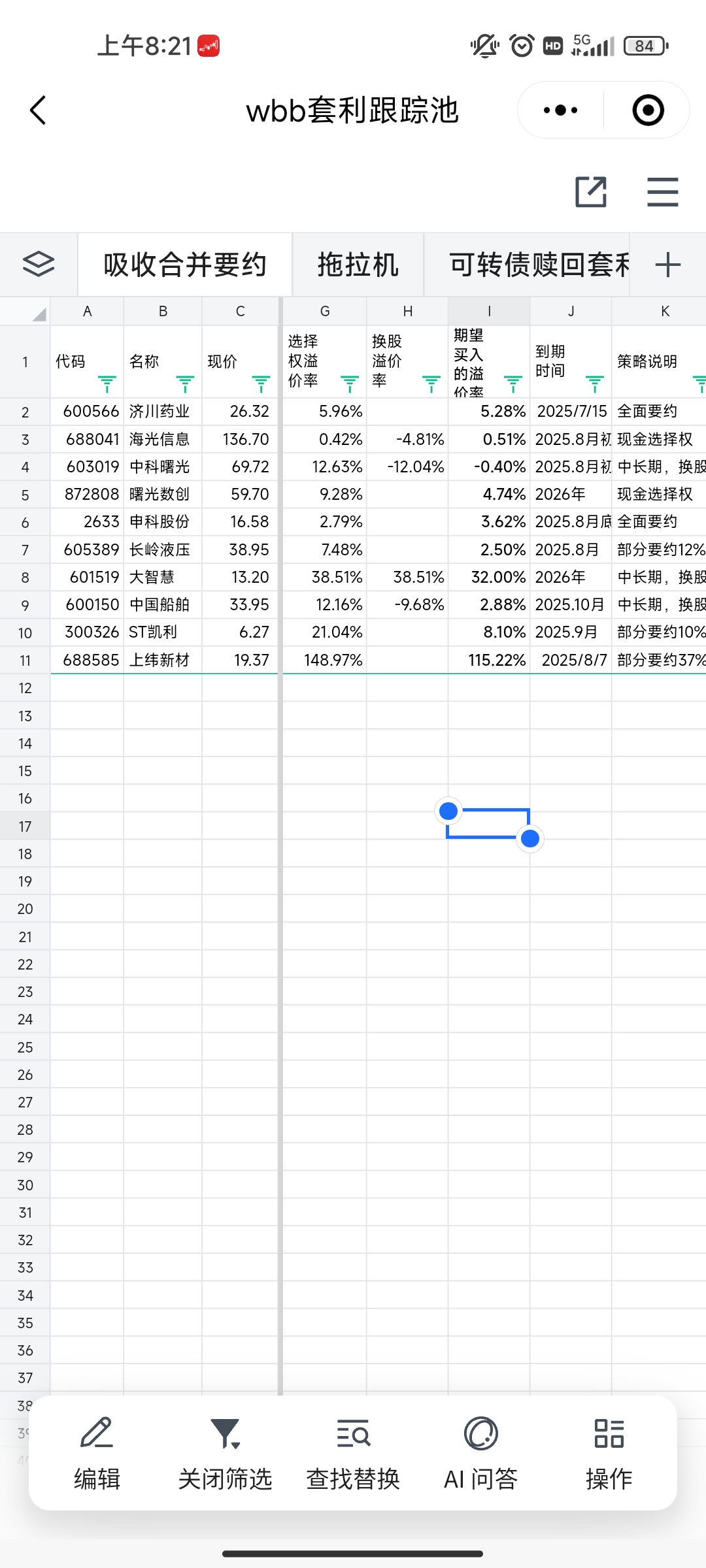 我做了一个简表【腾讯文档】wbb套利跟踪池 https://docs.qq.com/sheet/DTlR1bHdSVGJOZ2VP更新了一版,大家不要申请编辑权限,可以自己copy一份到您自己的腾讯文档自己用就行啦