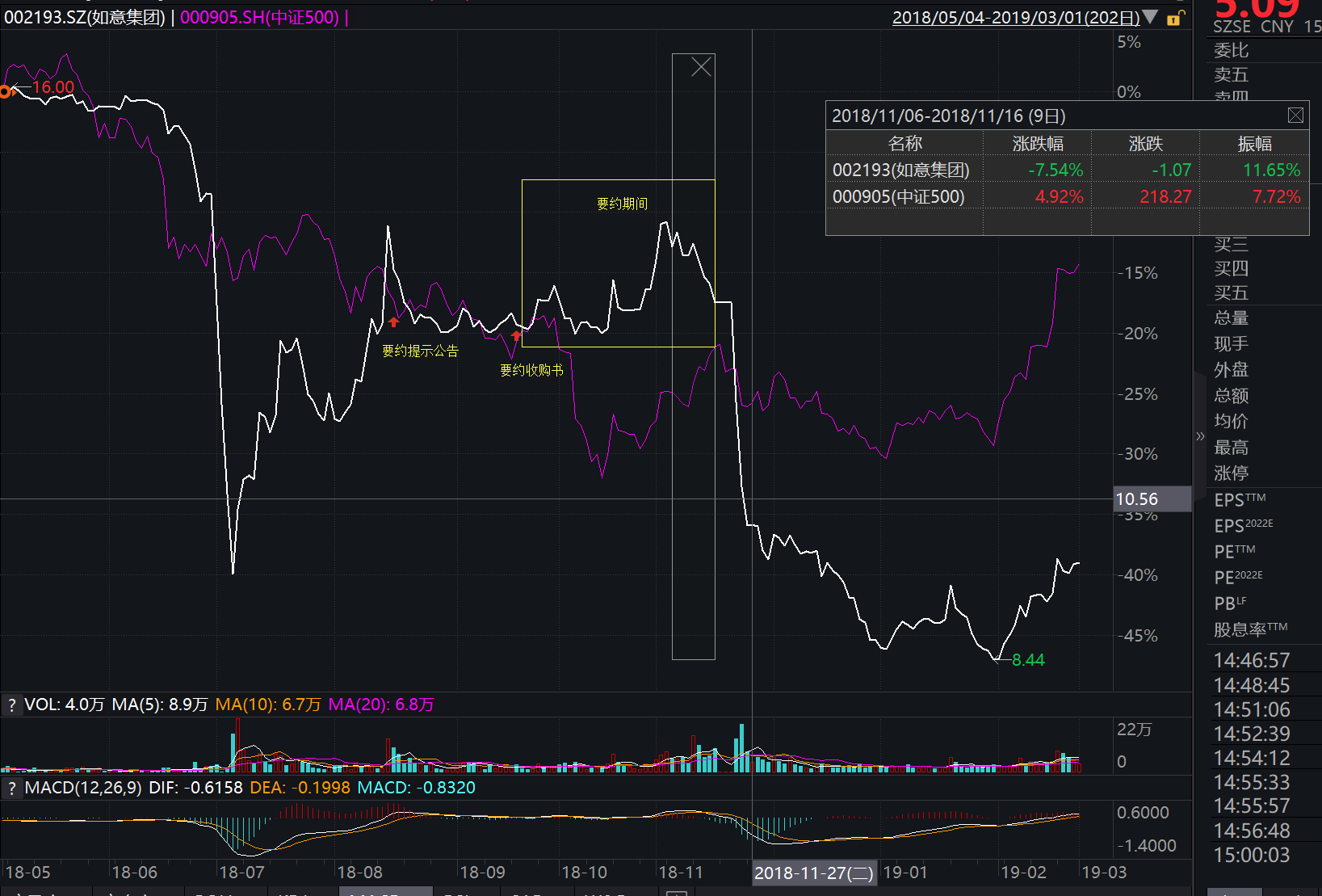 如意集团要约期限2018年9月19日至2018年11月16日,2018年9月19日中证500指数开盘4673.95,2018年11月16日中证500指数收盘4659.1,何来需要补跌?你理解错了,上面探讨如意集团的那个问题,不是说要约期开始和结束后的股价对比,而是说要约结束后的暴跌走势。我的意思是如意集团要约后的那段暴跌,刚好是碰上那段时间指数也是暴跌的,所以它当时的暴跌只是跟随指数而已。