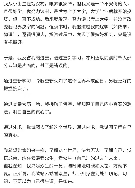 明心见性,见性成佛。辞职当天,我就写与魔鬼契约,与自己的人性对赌了。职业投资者,最后的结局一般是跳楼或进精神病院了。为了确保自己活到最后,今年更加注重佛学了。