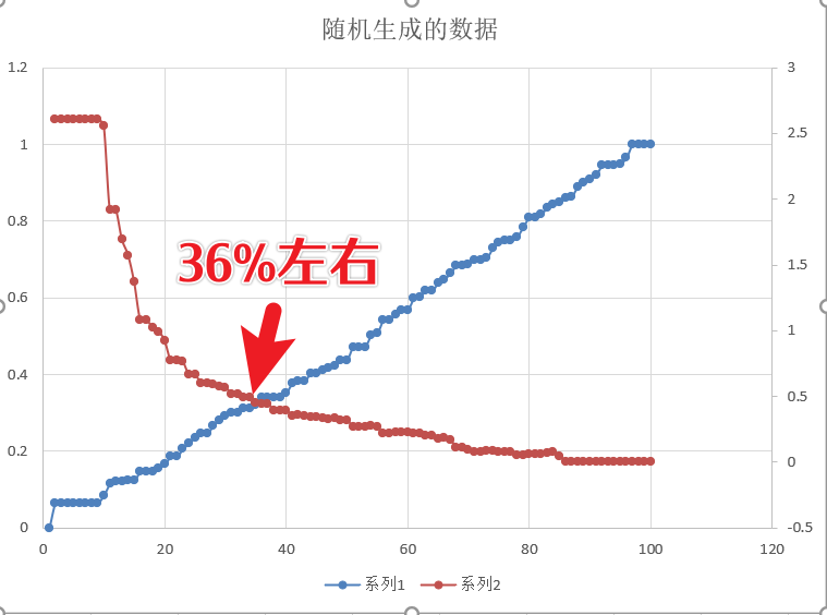 用随机生成的数据检验了代码,红线和蓝线会在36%左右相交,而且红线是呈一条弧线下降: