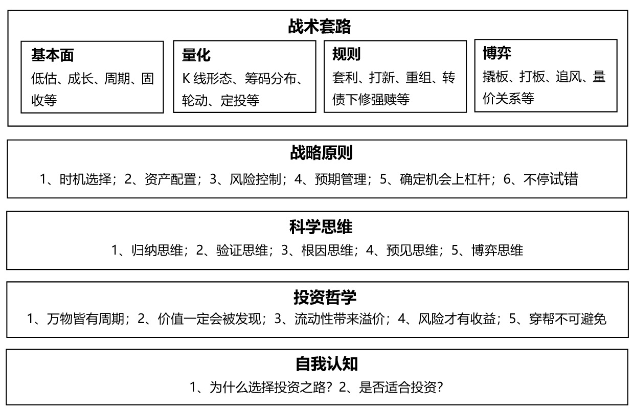 再往上是战略原则,这是投资活动中的共性的、重大的问题,包括方向选择、时机选择、如何管控风险、如何确定收益率等等。懂这些战略原则的,投资就开始入门了。