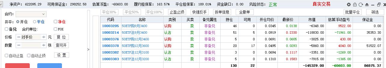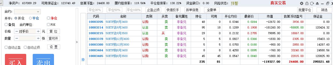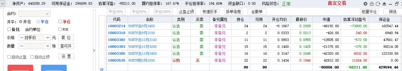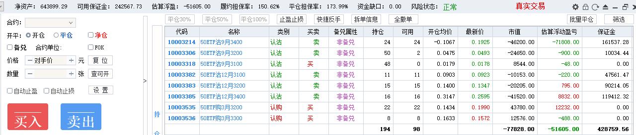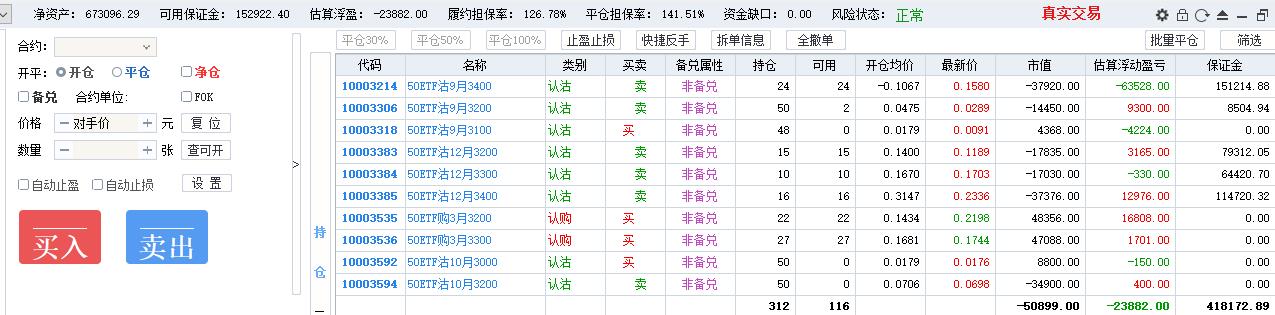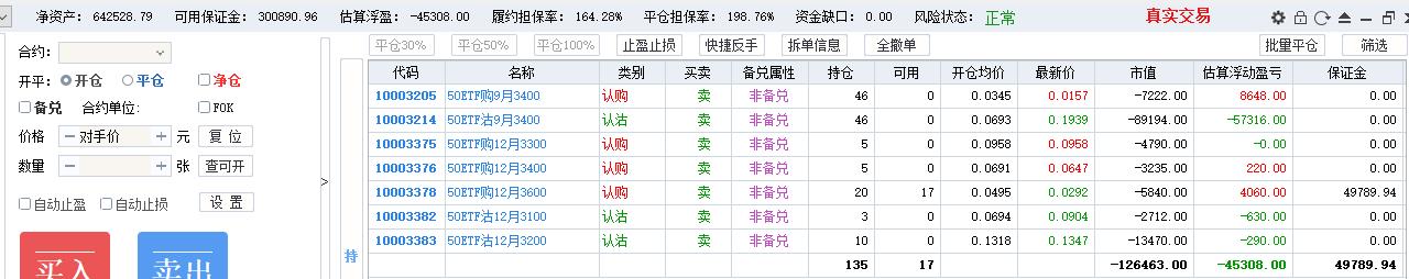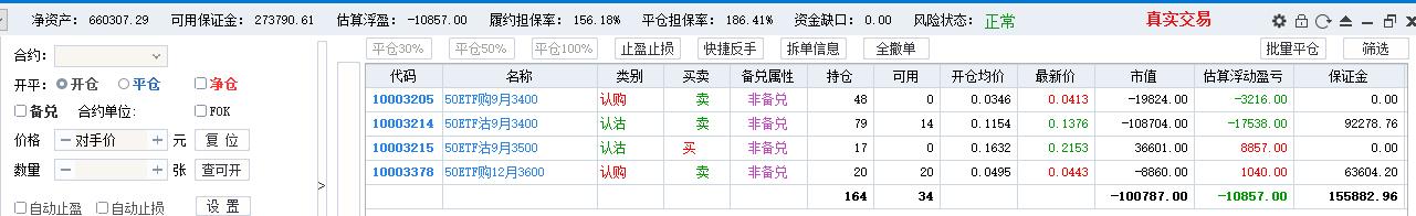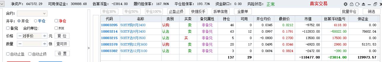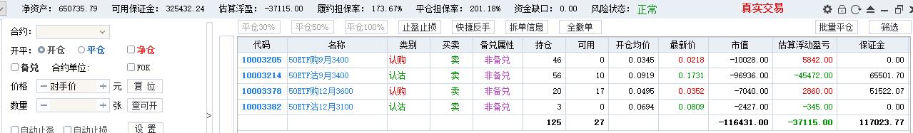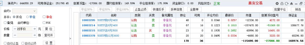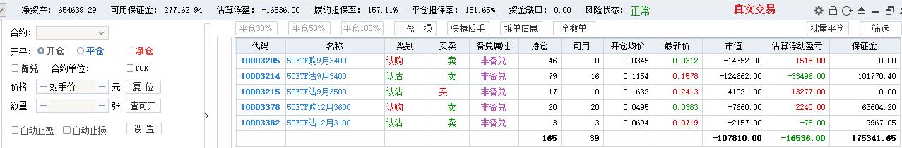 50期权当月卖购张数太多了,需要往后移仓收编,缩减张数,降低保证金占用,防御风险,下周一先不处理9月卖沽,把八月卖购与12月3800卖购全平了,换入15组12月3600卖购