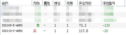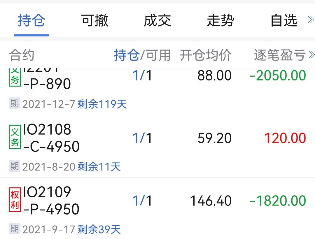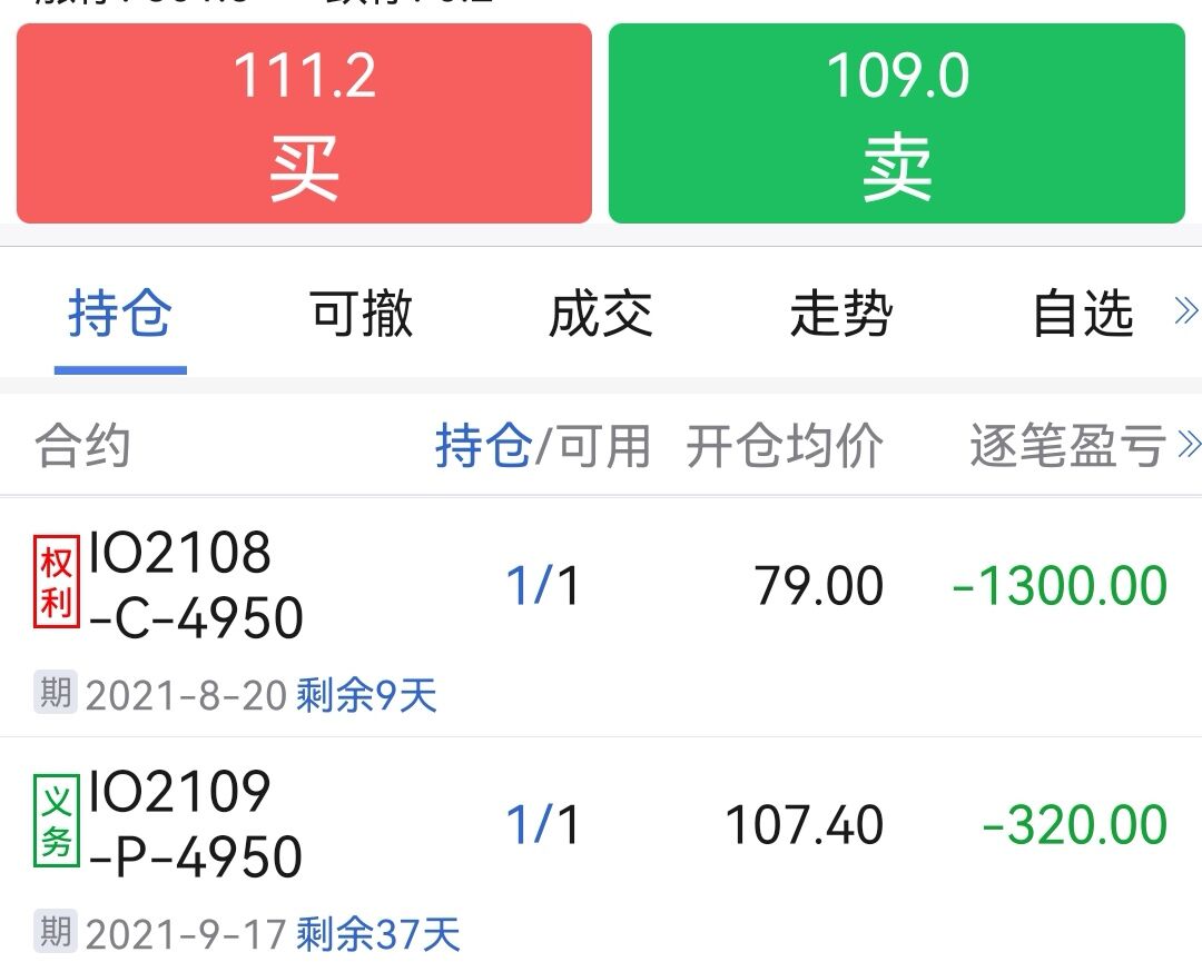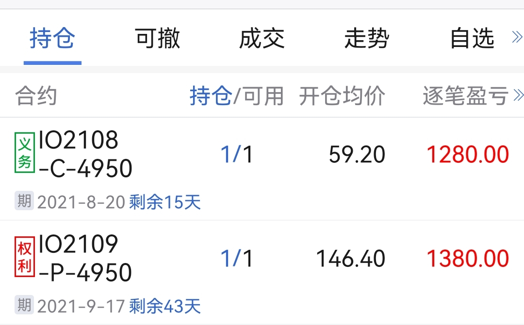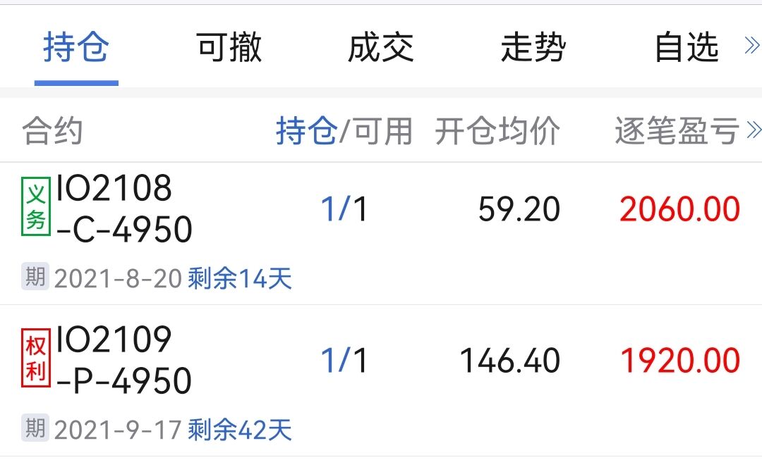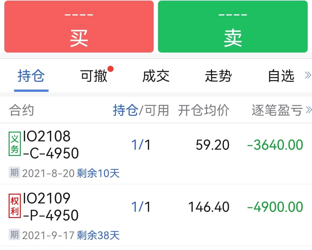 8/4尾盘建仓1组混合空头(卖开 IO 8月4950购 + 买开 IO 9月4950沽 各1手),