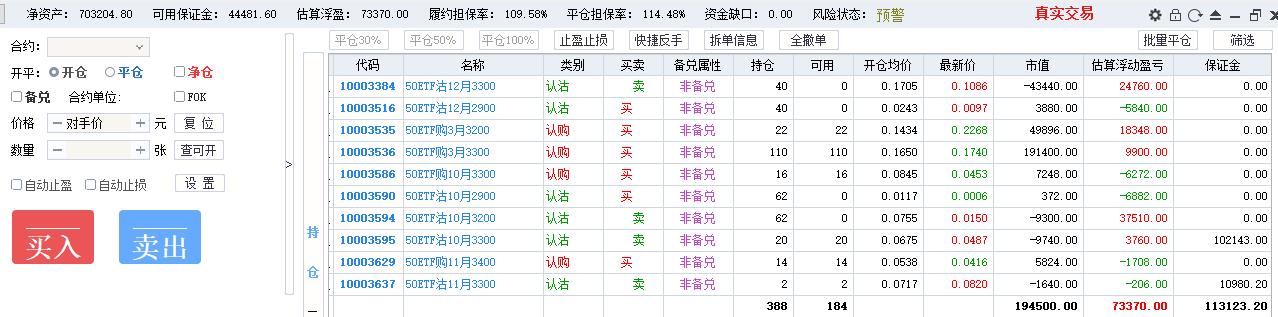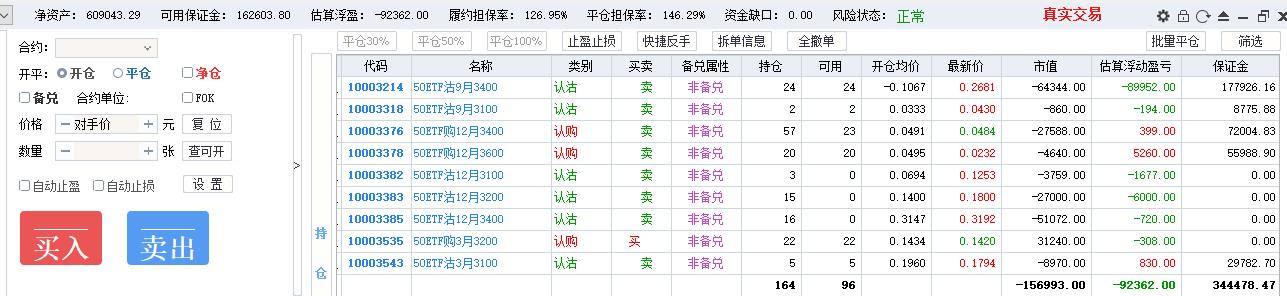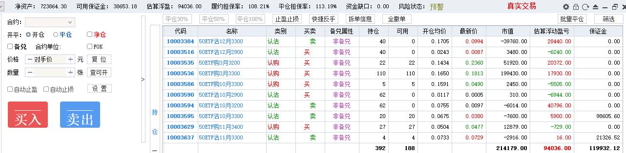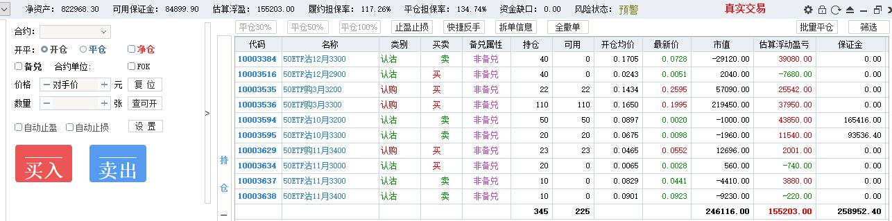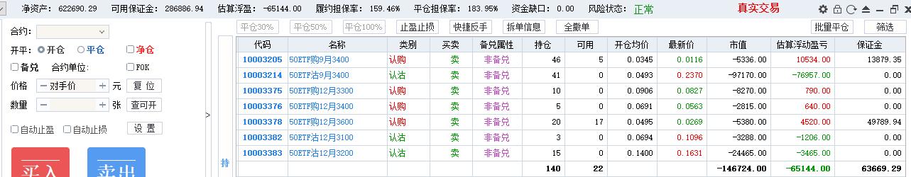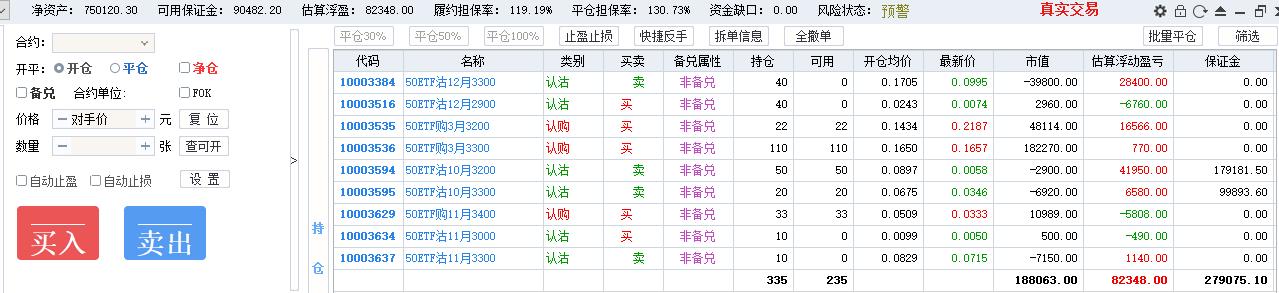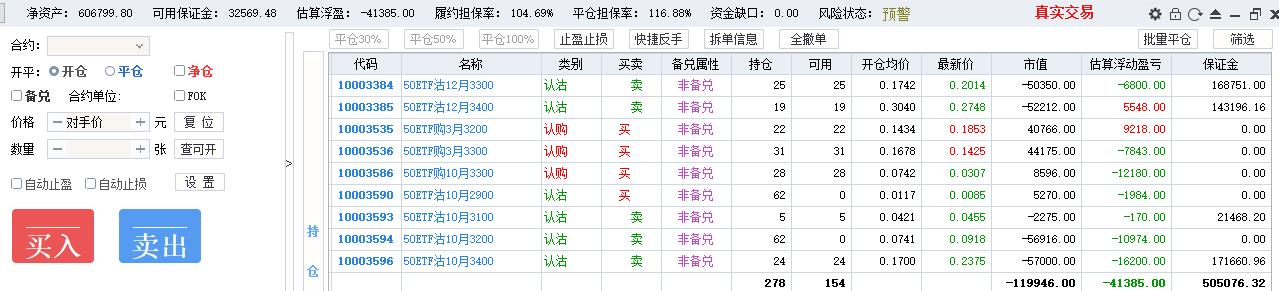 操作风格没有固定,摇摆于双卖与卖沽、全仓短线、全仓卖购之中,前期双卖抵抗,现货单边下跌,变成单腿卖沽,损失惨重,7月初买沽做空净值一度回本,回到双卖,无奈现货继续下跌,10月赌单边开了200张卖购,10月22日现货反弹4%,单日亏损16万,保证金风险度125%,券商电话过来要求追加保证金否则强平。最终自己操刀平掉120张卖购,加开80张卖沽做多,第二天现货跌3%遭遇双击。全年最终亏损。