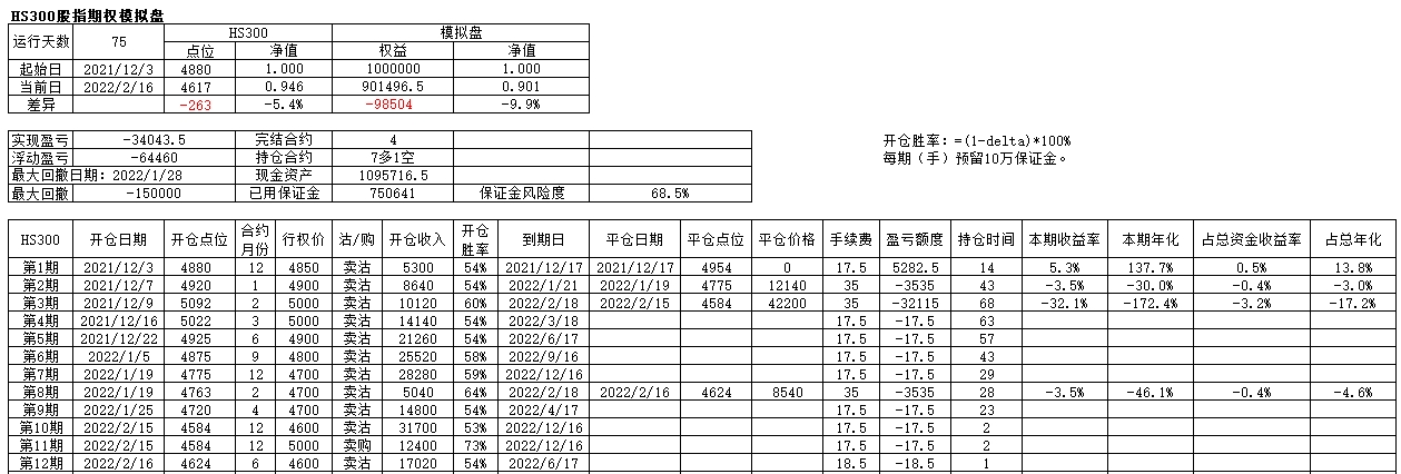 2022年到2/10为止 亏损17.5万,净值0.735。当前持仓 delta 92,折合仓位391%。