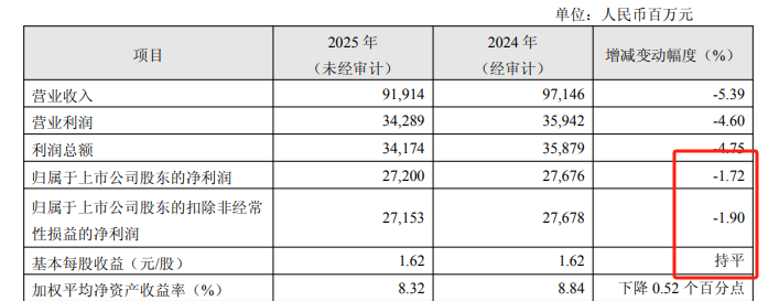谢谢提醒。其实每股收益是下降的。2024 年基本每股收益:27676 ÷ 15915 ≈ 1.6200 元 / 股2025 年基本每股收益:27200 ÷ 15915 ≈ 1.6199 元 / 股二者计算结果仅差 0.0001 元 / 股,按上市公司常规披露的 “保留两位小数” 精度取数后,均为 1.62 元 / 股,因此业绩快报中显示为 “持平”。等看看年报的分红数据,如果股利支付率继续保持在...归属于上市公司股东收益包括了付给优先股永续债的利息和普通股股东的收益。