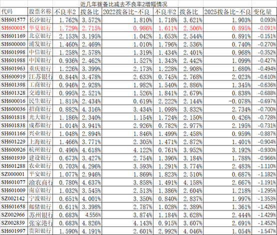 拨备覆盖率可人为调到无穷大,参考意义极低。 - 把近一年不良率2、拨贷比的变化量,扣25%税后,折算进当年利润。