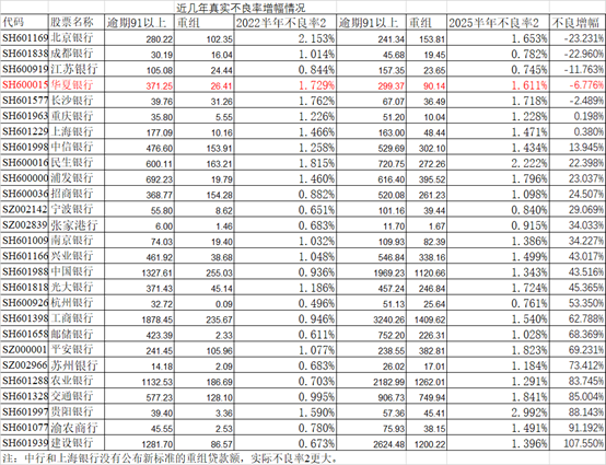 每个行定义不良的尺度不同,同一个行2025年和2024年的尺度也不一定相同。为了可比,我定义了不良率2, 就是(逾期91天及以上贷款+重组贷款)/总贷款。我用这个不良率2列个表,看看哪些行变好,哪些行变差。因为逾期贷款和重组贷款只有半年报才有,下面取2022年半年报和2025年半年报数据