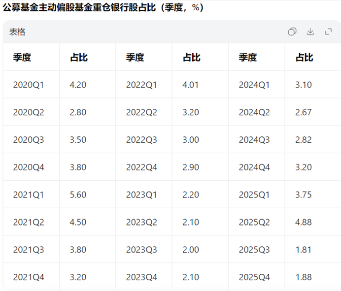 离谱的原因是因为公募基金经理们的偏见。据统计,2024年A股上市银行的利润占所有A股上市公司利润的41%,而公募主动偏股基金持有银行股的比例极低。前些年公募偏股基金持有银行股占比高点位置:2014年4季度为9.12%,2018年4季度为7.34%。最近几年看下表: