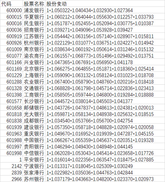 每个行分红不同,股息率不同,分红到账当日分红再投,增加的股份比例肯定不同。另外参与正股发行可转债也增加股份。我写了程序,计算了2022年年报至2024年报的分红(2025年半年报分红,有的行分了,有的行没有分,统一不计算。),分红再投和可转债导致的股本增长情况: