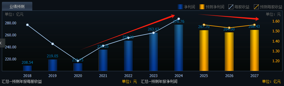 过去四年华夏银行的业绩的确不错,但研报对它未来三年的业绩不太乐观。见下图,蓝色部分是历史盈利,黄色部分是未来盈利预测。