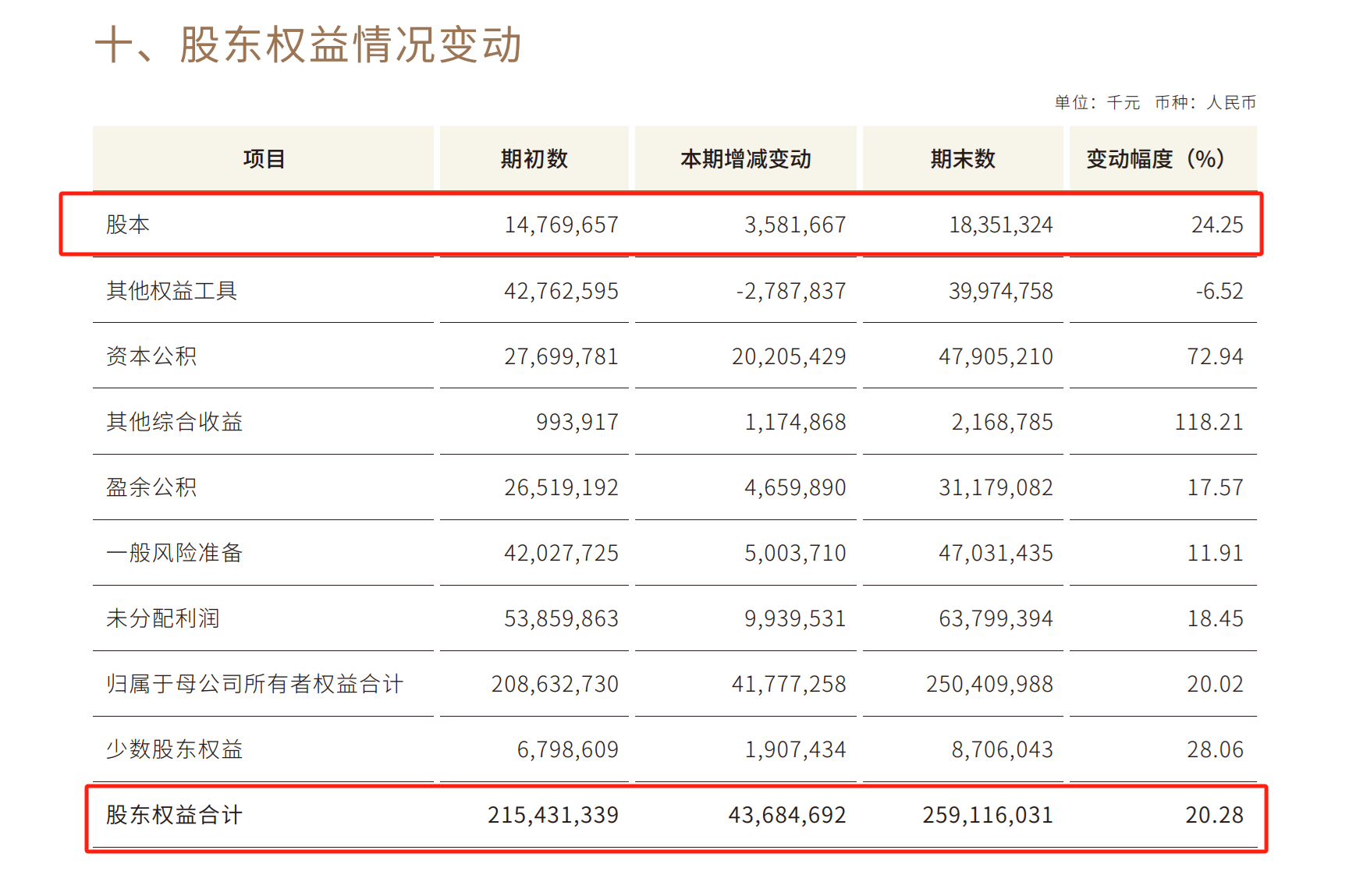 抱歉,我说的是可转换债券,记错了。可转换债券并不是100%配售老股东的,实际只有56.35%,其余向公众开放申购,大大稀释了老股东的权益。下图截取自2023年江苏银行年报。2023年江苏银行“股东权益合计”增加了20.28%,股本增加了24.25%。计算可知,期初每股权益14.58元,期末每股权益14.12元,2023年每股分红0.47元,(14.12+0.47)=14.59。 14.59-14...我不看那么多的,现在我最看重的就是股息率。就算今年保持去年的分红水平,江苏银行的股息率是5%多,现价计算超过招行,兴业。看增长率,招行,兴业,五大行更是无法比。