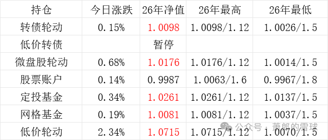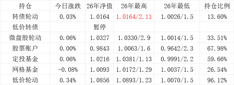 3、微盘股轮动年初净值为1.000,今日 +0.14%,净值为1.0014。本年最高净值1.0014(1.5),最低净值1.0014(1.5),仓位48.60%