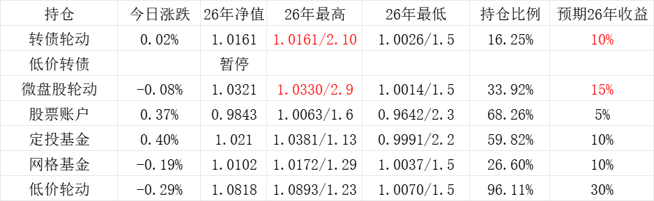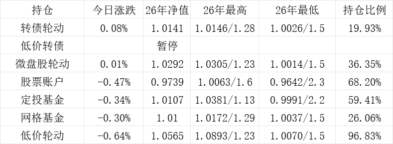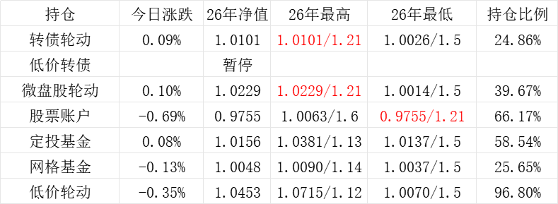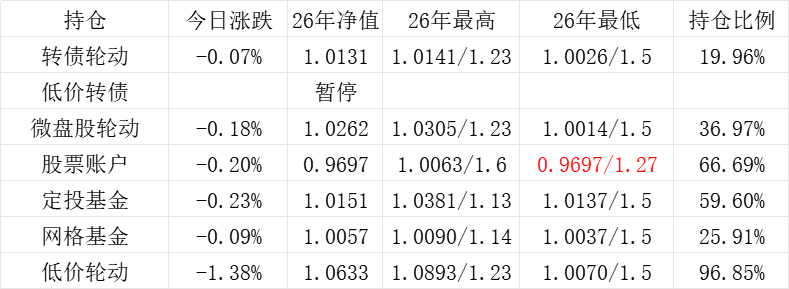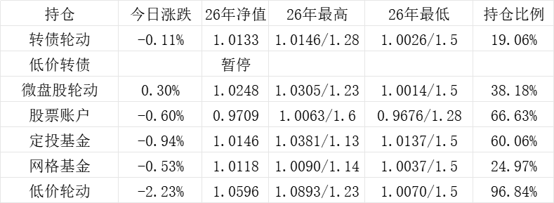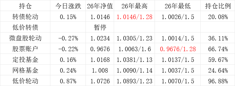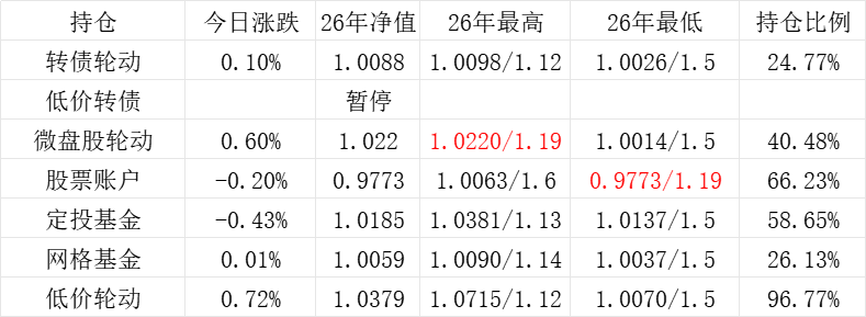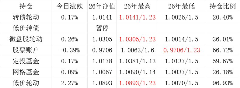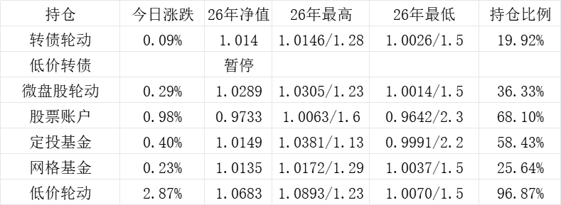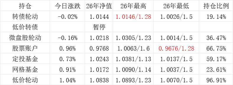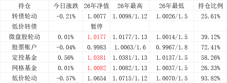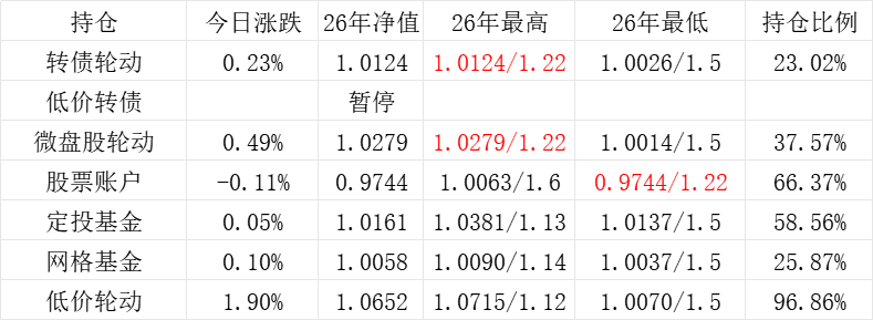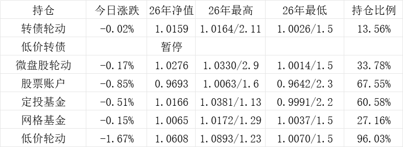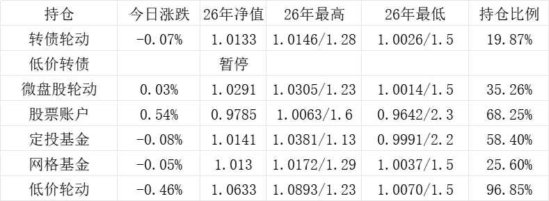 3、微盘股轮动年初净值为1.000,今日 +0.05%,净值为1.1422。本年最高净值1.1424(9.16),最低净值1.000(1.2),仓位44.26%