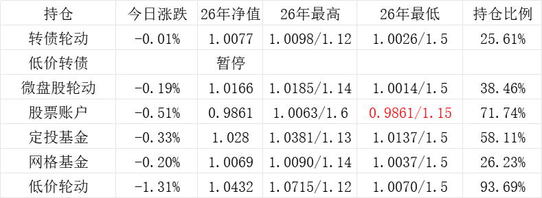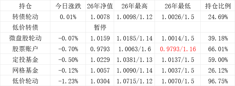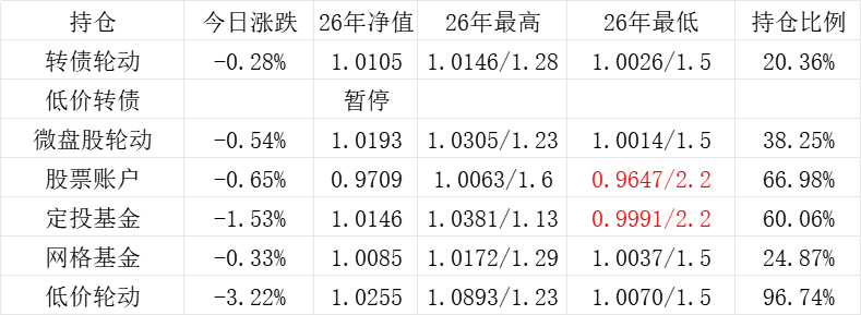 3、微盘股轮动年初净值为1.000,今日 -0.49%,净值为1.1361。本年最高净值1.1424(9.16),最低净值1.000(1.2),仓位25.65%