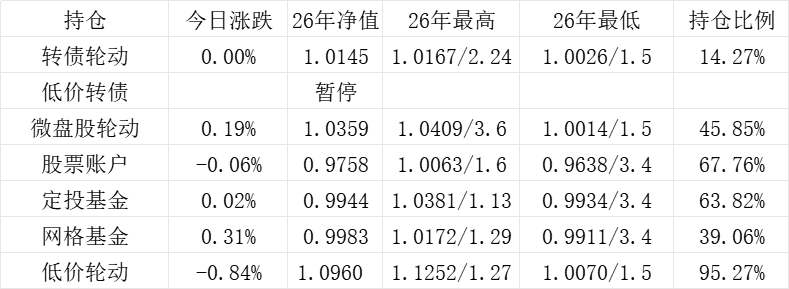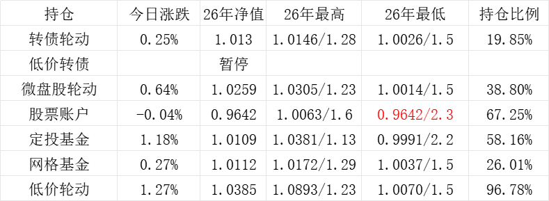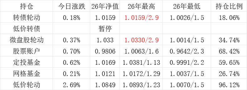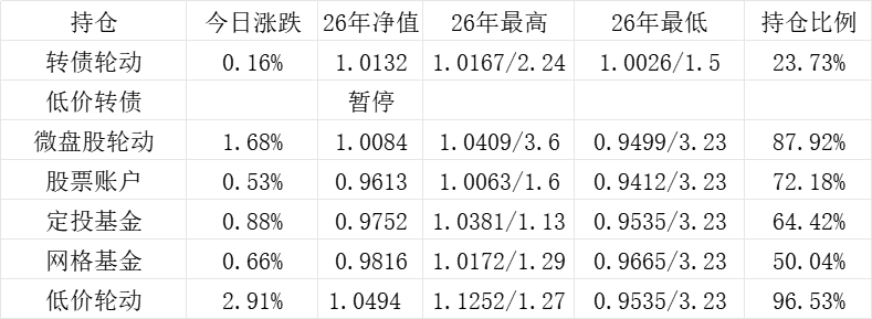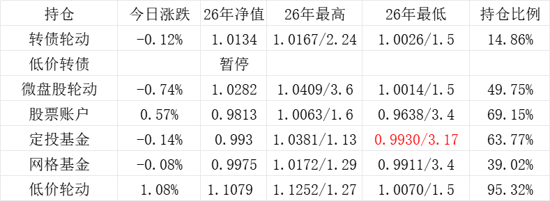 3、微盘股轮动年初净值为1.000,今日 +0.26%,净值为1.1568。本年最高净值1.1816(11.14),最低净值1.000(1.2),仓位56.61%