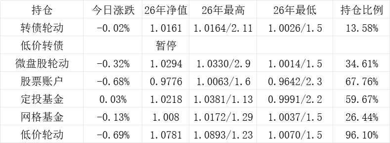 3、微盘股轮动年初净值为1.000,今日 -0.03%,净值为1.1692。本年最高净值1.1708(10.23),最低净值1.000(1.2),仓位29.68%