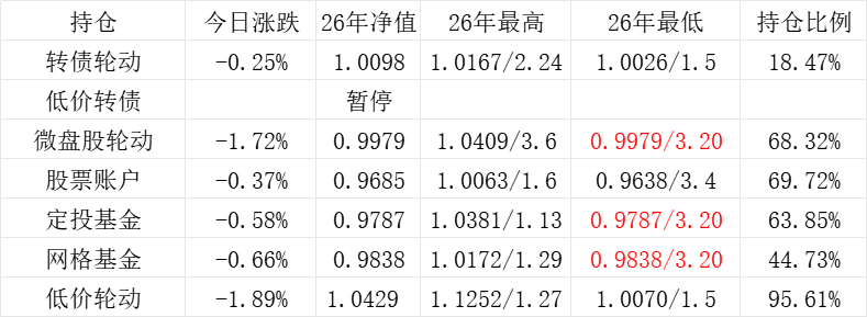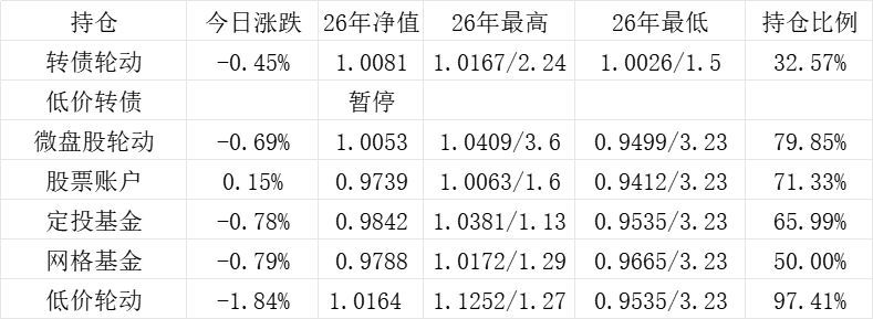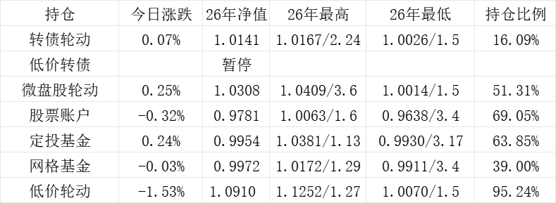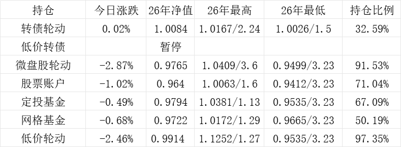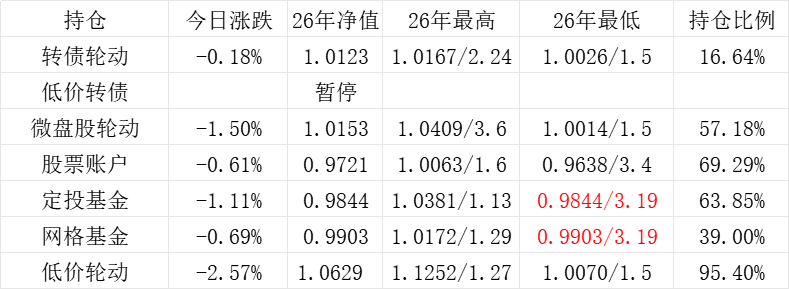 3、微盘股轮动年初净值为1.000,今日 -0.45%,净值为1.1534。本年最高净值1.1816(11.14),最低净值1.000(1.2),仓位58.72%