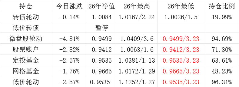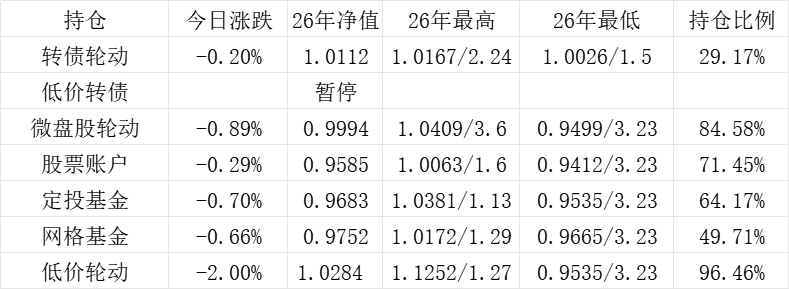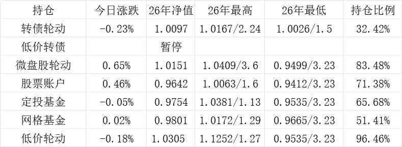 3、微盘股轮动年初净值为1.000,今日 -0.40%,净值为1.1653。本年最高净值1.1816(11.14),最低净值1.000(1.2),仓位39.23%