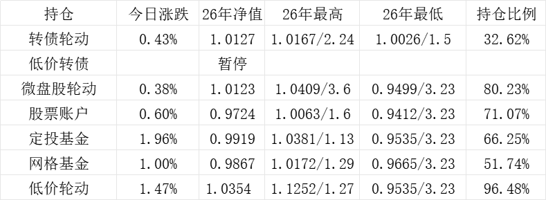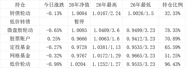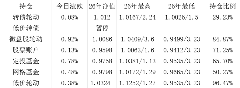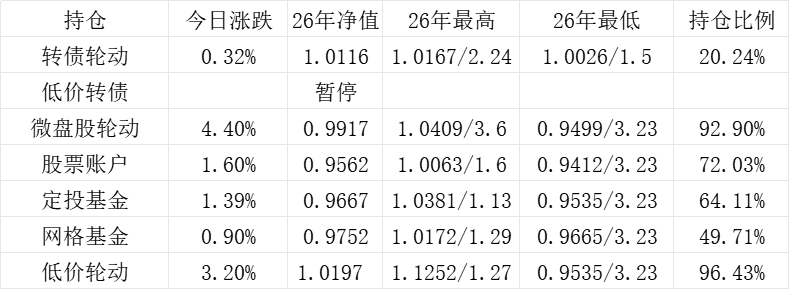 3、微盘股轮动年初净值为1.000,今日 +0.32%,净值为1.1726。本年最高净值1.1816(11.14),最低净值1.000(1.2),仓位35.94%