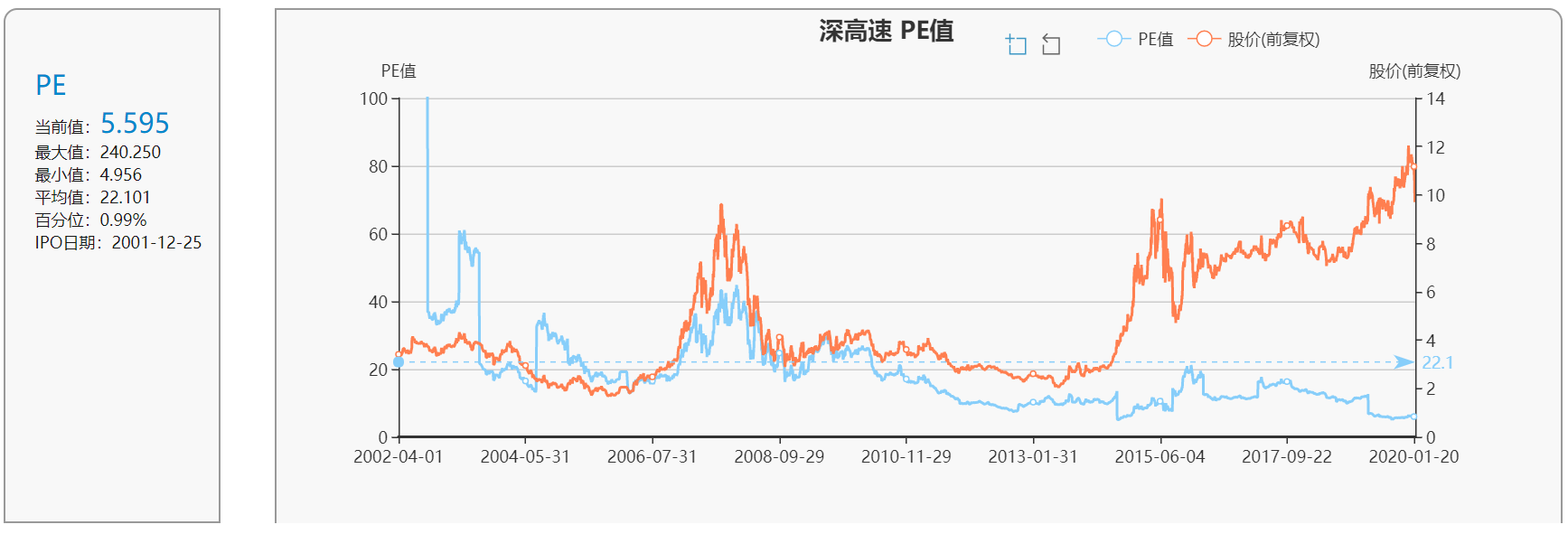 下图为深高速A的历史PB数据,当前仅次于2014年熊市末期,属于很低的水平。PB的参考意义较大,但是如果没有H股作为参考,深高速也只算的上是“相对于历史上的自己是低估的”,并不能引起我的投资兴趣。